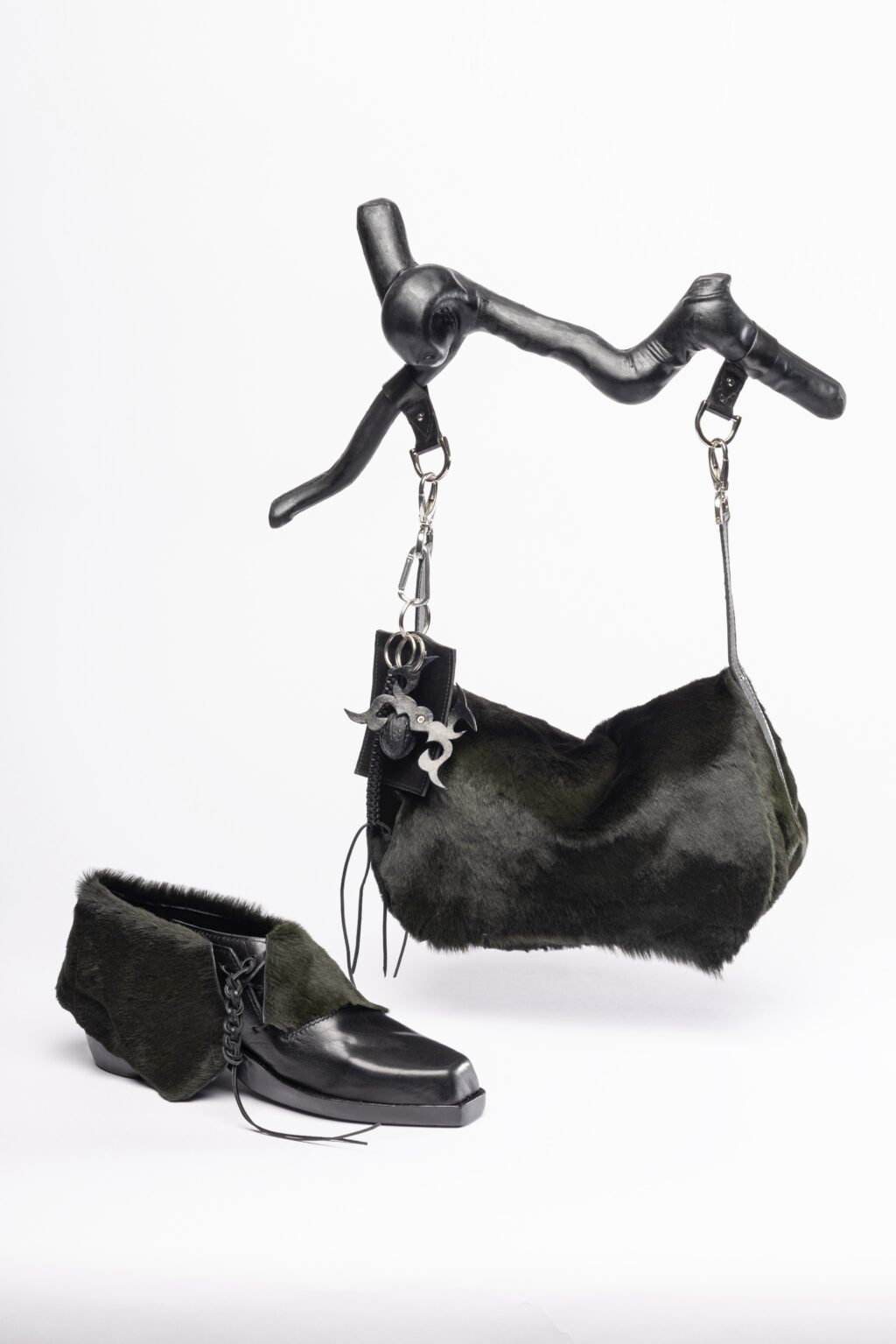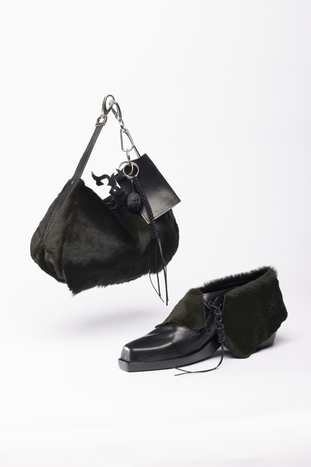 Fur plays a significant role in both products, as its soft and gentle character evokes the same fragility and impermanence as fog. To visually ground the composition, I chose black glossy leather, which emphasizes the form of the objects and brings a sense of stability and weight.