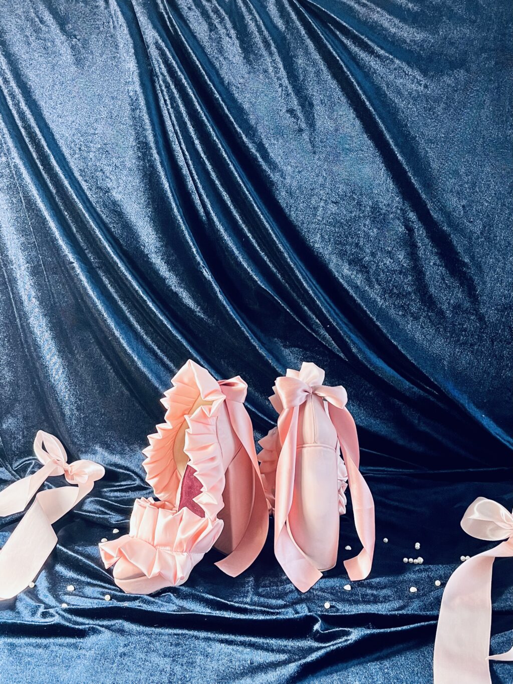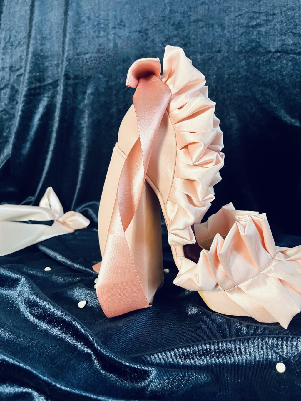 Cotton candy is a fragile, amorphous, deconstructed essence of childhood, captured on a stick. It is not food, but an atmosphere: it is the texture of a dream, materialized breath. This footwear reflects its instability and irregular spinning. The pumps are deliberately amorphous, for the massive heel and sole are mere illusion, lacking any real support. Lightness is introduced by the satin lining the toe and heel. The final bow is the last stitch, the icing on the cake; because after this sugar snowstorm, everyone simply wants to tie the knot.