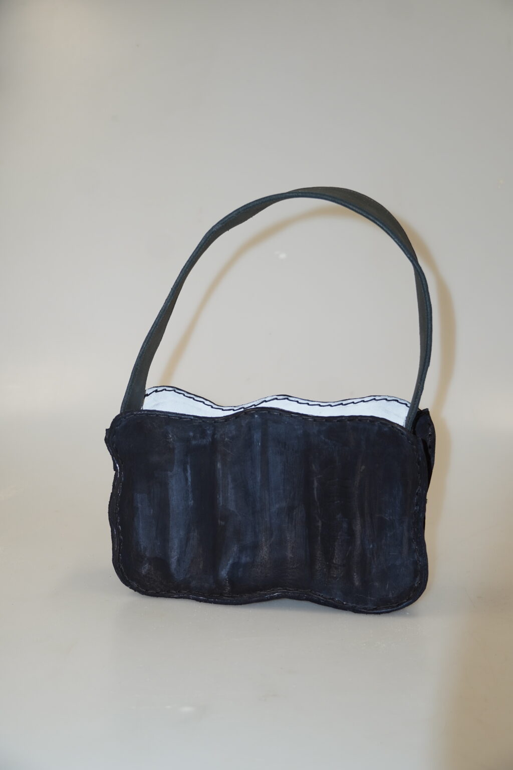 The collection explores the theme of metamorphosis from larva to butterfly as a symbol of gradual transformation. This narrative is reflected in the design of both the handbag and the footwear. The handbag represents the initial stage of development — the larva. Its form is closed and compact, conveying a raw, restrained character that suggests an undeveloped state and hidden potential.