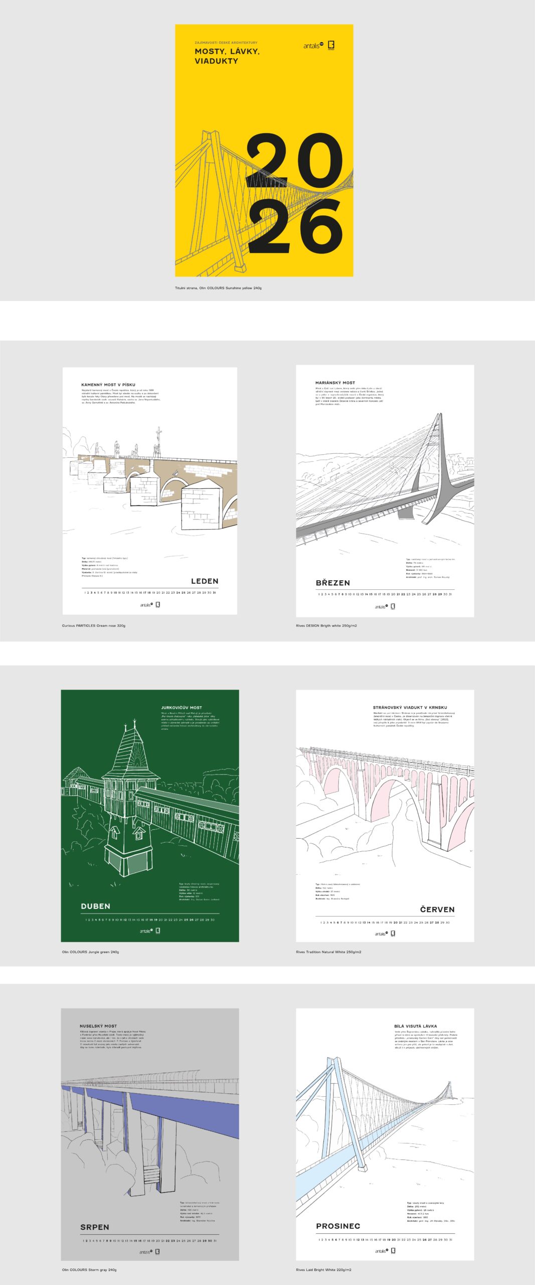 Pro Antalis kalendář s tématem zajímavostí české architektury jsem zvolila mosty, lávky a viadukty. Vybrala jsem si šest měsíců a k nim šest konstrukčně i historicky zajímavých mostů: Kamenný most v Písku, Mariánský most, Jurkovičův most, Stránovský viadukt v Krnsku, Nuselský most a Bílou vysutou lávku.