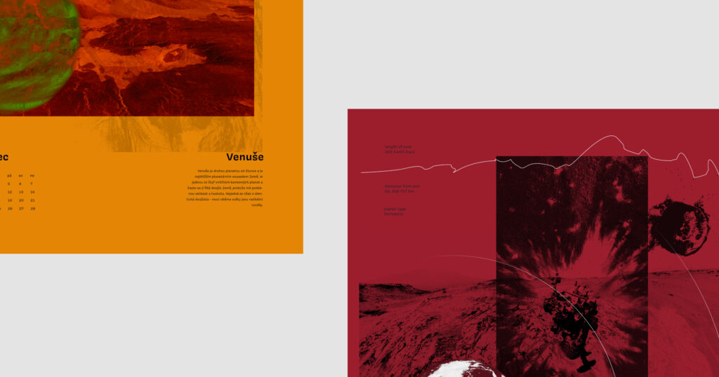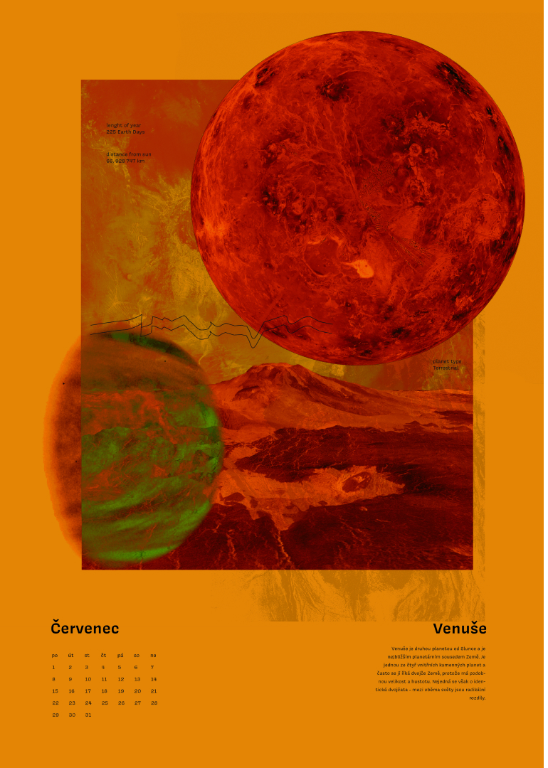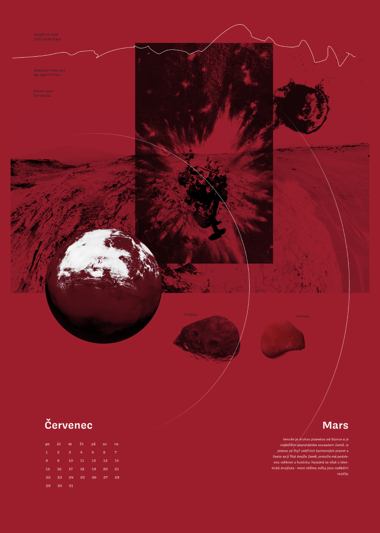 Na jednotlivých listech kalendáře jsem se rozhodla pomocí koláží znázornit různé objekty naší sluneční soustavy. Pokusila jsem se pomocí fotek, textur, barev a jejich vrstvení co nejlépe vystihnout atmosféru dané planety či objektu. Celou koláž jsem poté doplnila minimalistickým kalendáriem a informacemi o daném astronomickém objektu, abych jej divákovi co nejlépe představila nejen vizuálně, ale i fakticky.