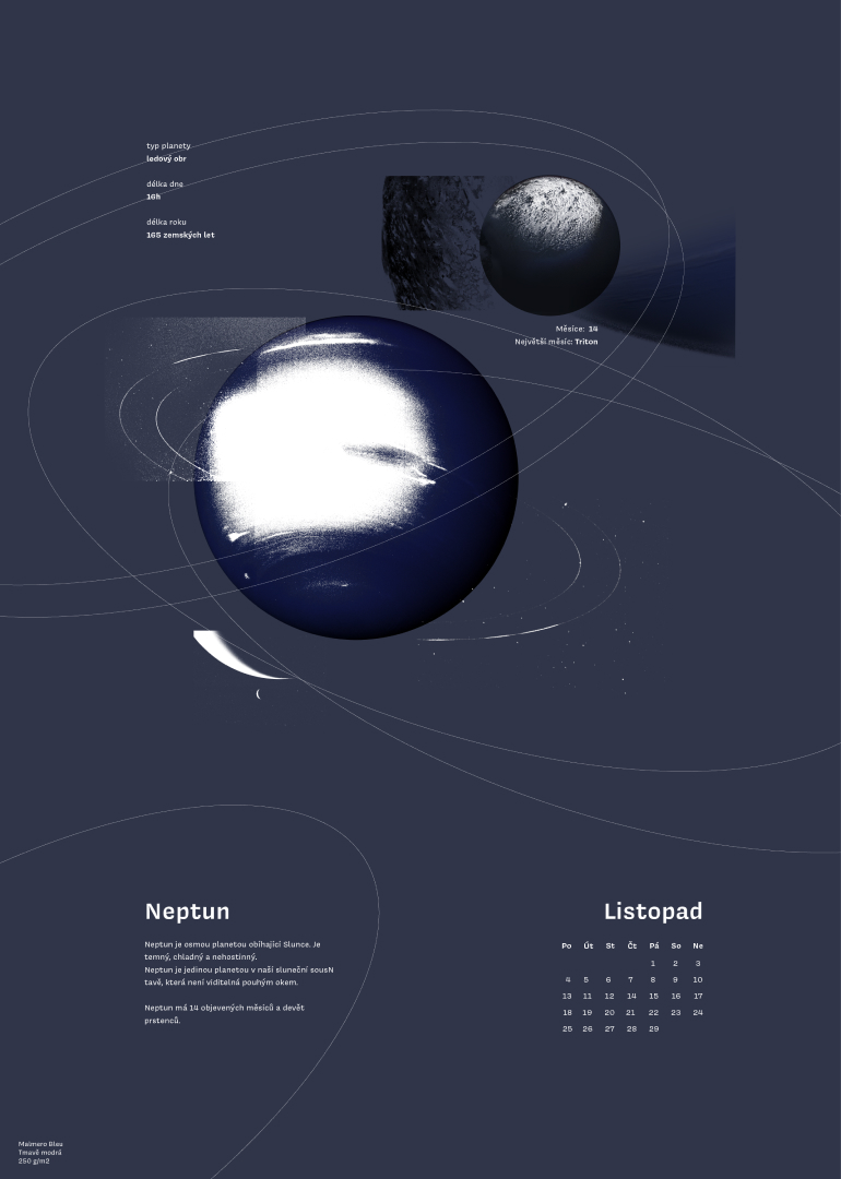 Účelem kalendáře je mimo jiné představit papíry z portfolia firmy Antalis. Jednotlivé papíry jsem přiřazovala k tématům na základě barevnosti planet či objektů. Vždy jsem se snažila nechat dostatek plochy nepotištěný, aby mohly papíry vyniknout.