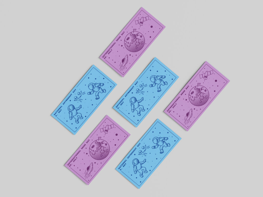 Pohľadnice sú venované sviatkom International Moon Day, National Astronaut Day a National Space Day. Grafické riešenie je založené na jednotnom rozložení, vesmírnej farebnosti a moderných ilustráciách, ktoré podporujú tému vesmíru.