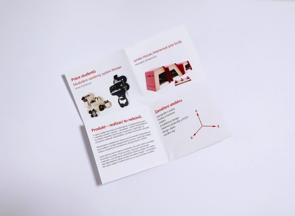 Informační brožura ateliéru Produktový design nabízí pohled na studijní program, představuje studentské práce a slouží jako praktický manuál pro uchazeče, včetně důležitých termínů a kontaktních údajů.