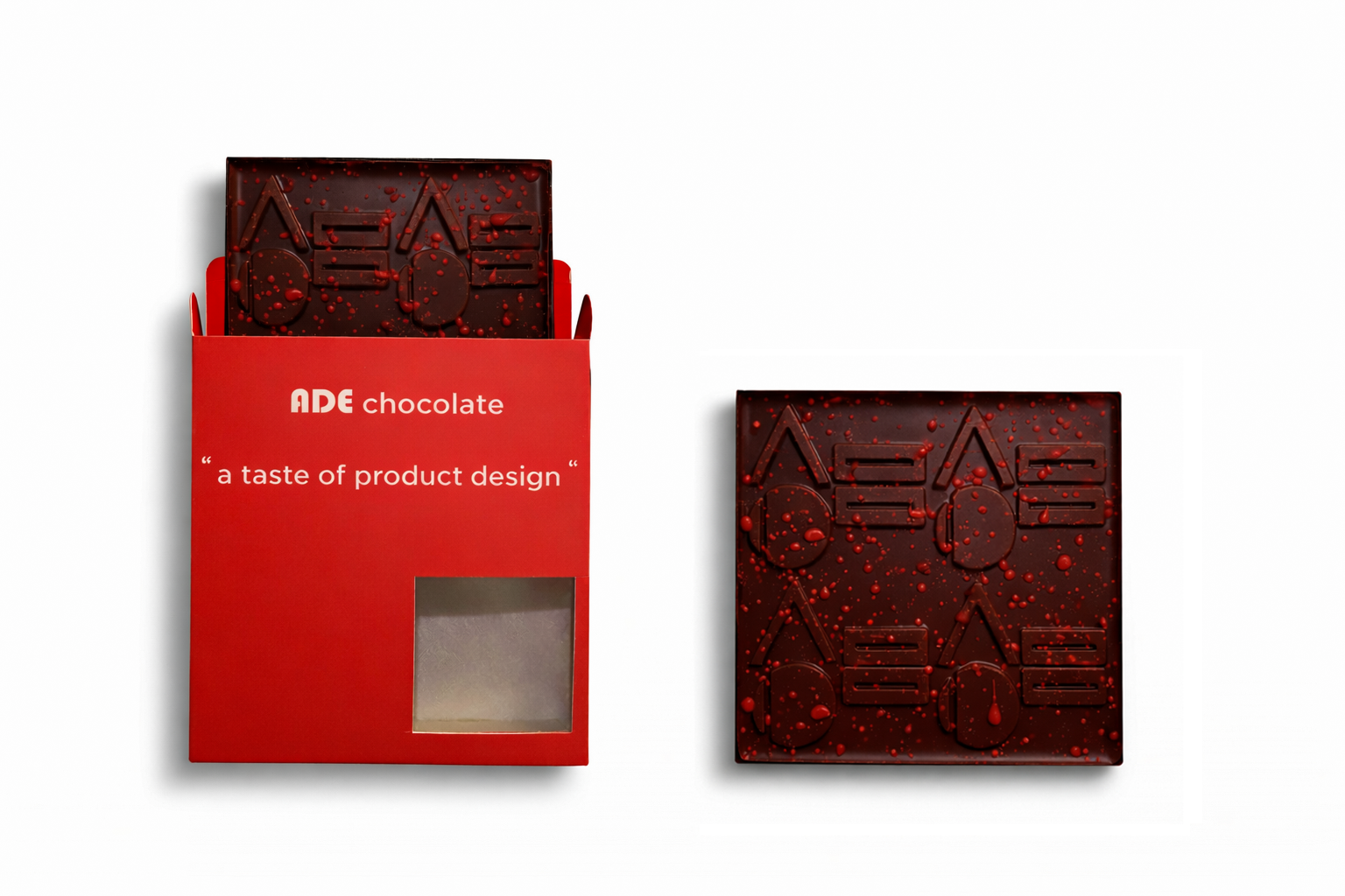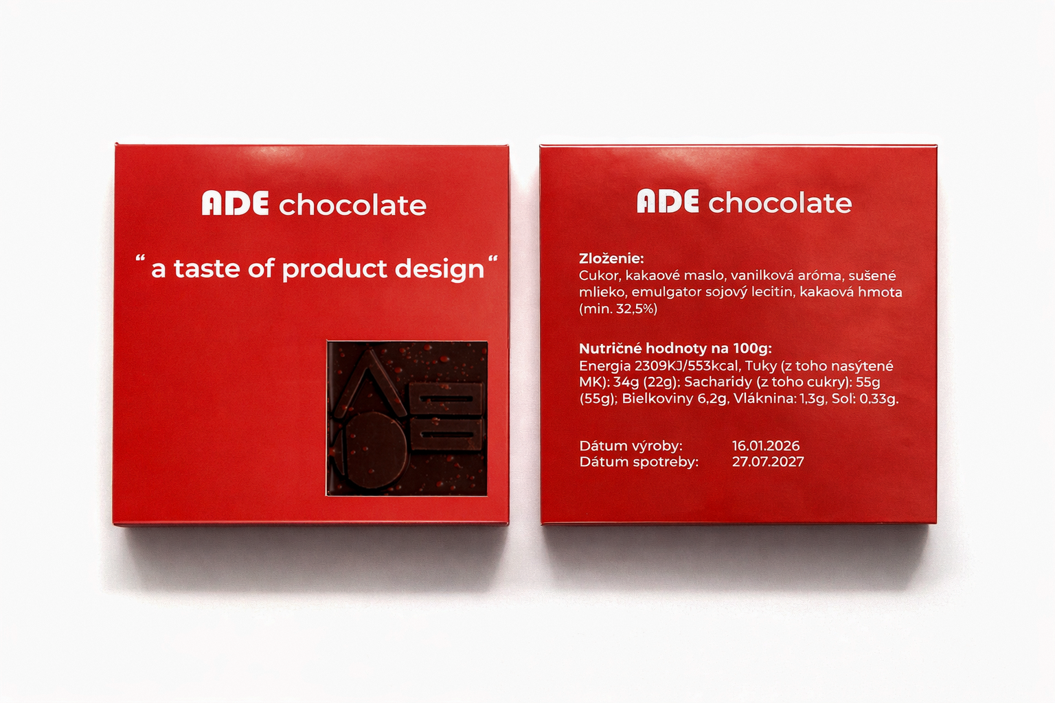 Navrhnutá čokoláda prenáša vizuálnu identitu Ateliéru produktového dizajnu do hmotnej a zmyslovo vnímanej podoby. Geometrický reliéf vychádza z autorského loga a pracuje s kontrastom presných tvarov a organických červených akcentov.