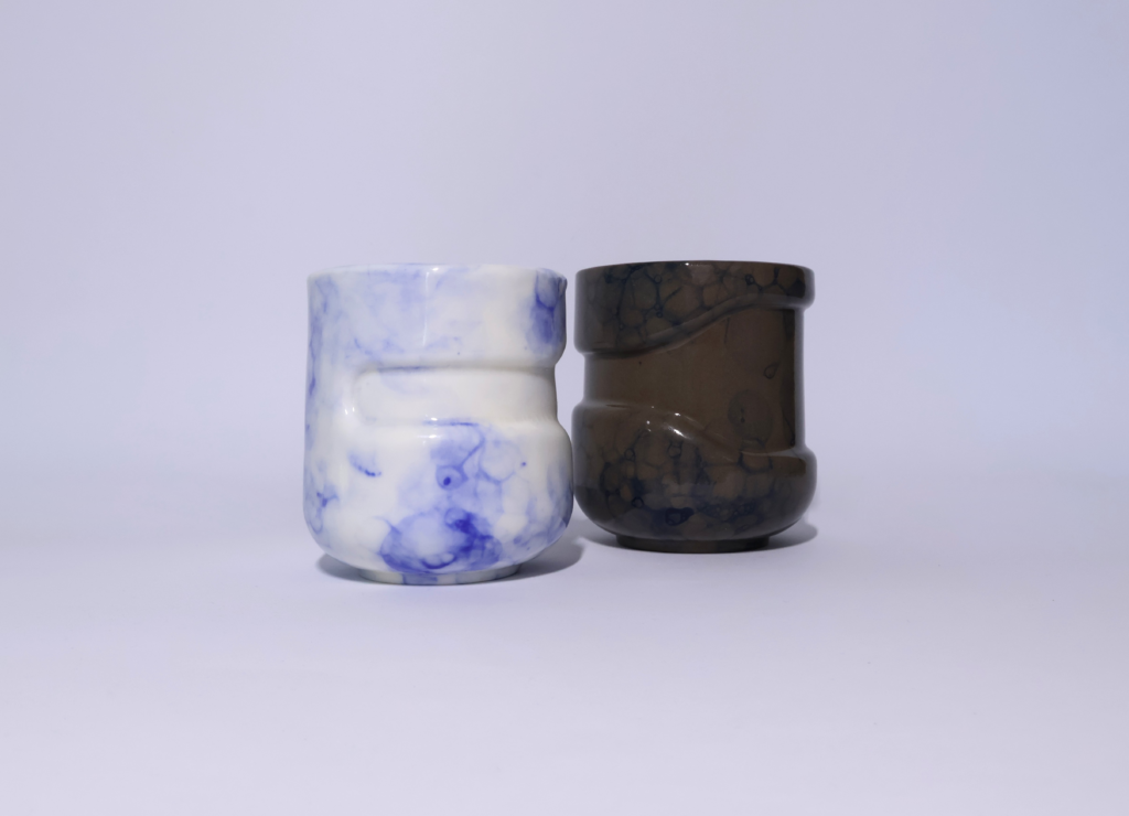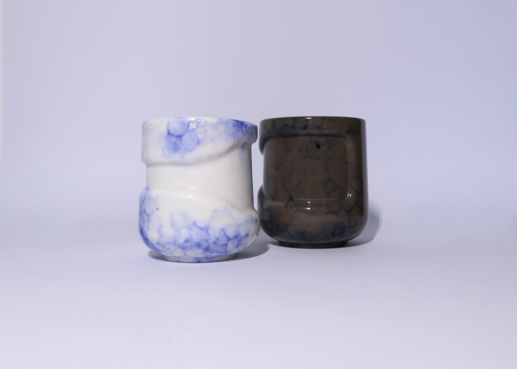 Sada tvořící porcelánový a černý kameninový hrnek. Oba zdobí bublinkový dekor.