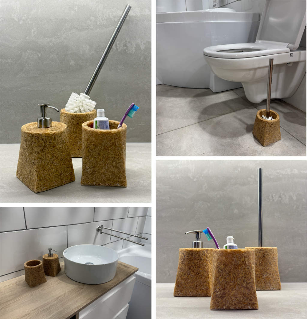 Tato sada tří koupelnových doplňků je vyrobena z upcyklovaného mláta a pryskyřice, které společně vytvářejí jedinečnou, neopakovatelnou strukturu. Každý kus je originál vzniklý z odpadu pivovarnického procesu. Sada obsahuje kelímek na zubní kartáčky, mýdlenku a držák na toaletní kartáč. Doplňky jsou navrženy s důrazem na funkčnost, trvanlivost a udržitelný přístup k materiálům.