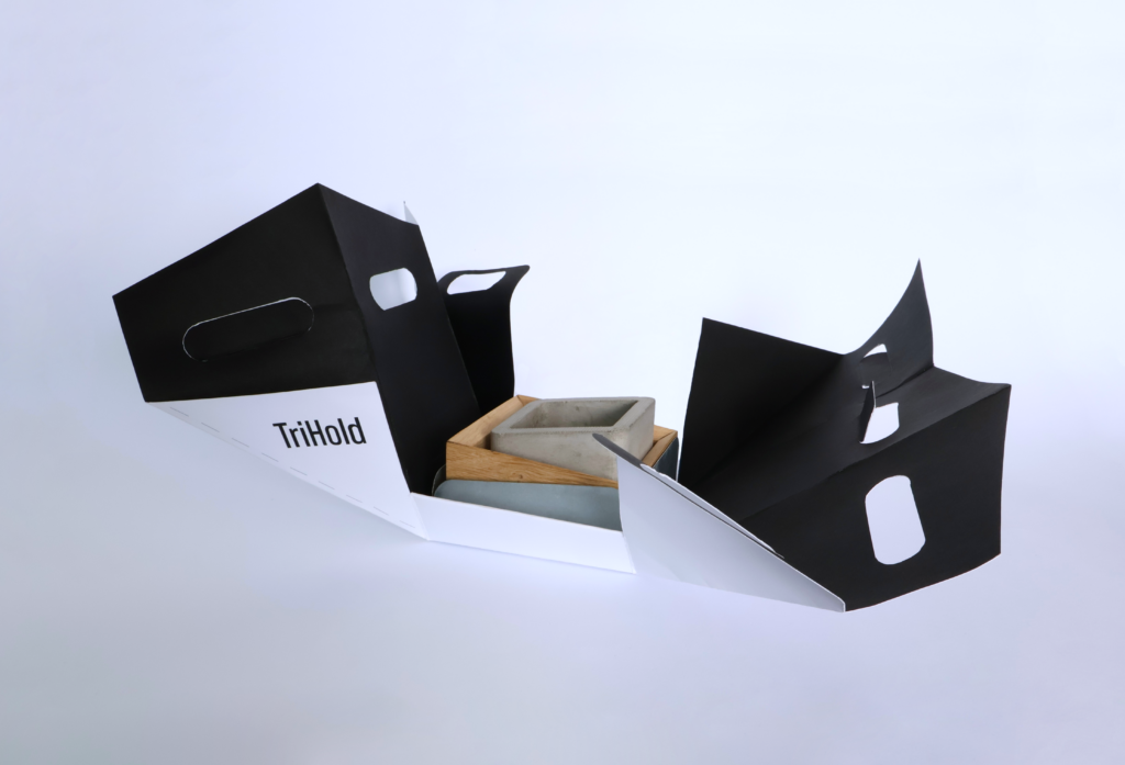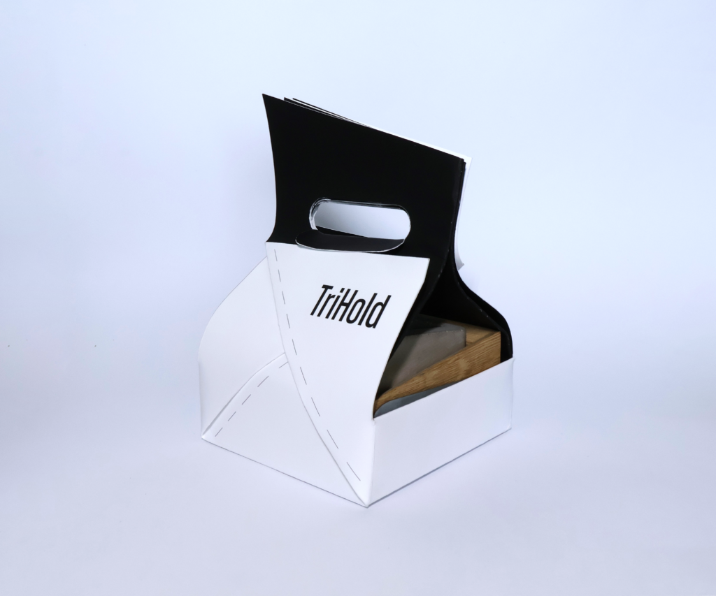 Obal je navržen pro sadu tří těžítek Trihold a vzniká z jednoho kusu papíru formátu A2 (180 g/m²) bez použití lepení.