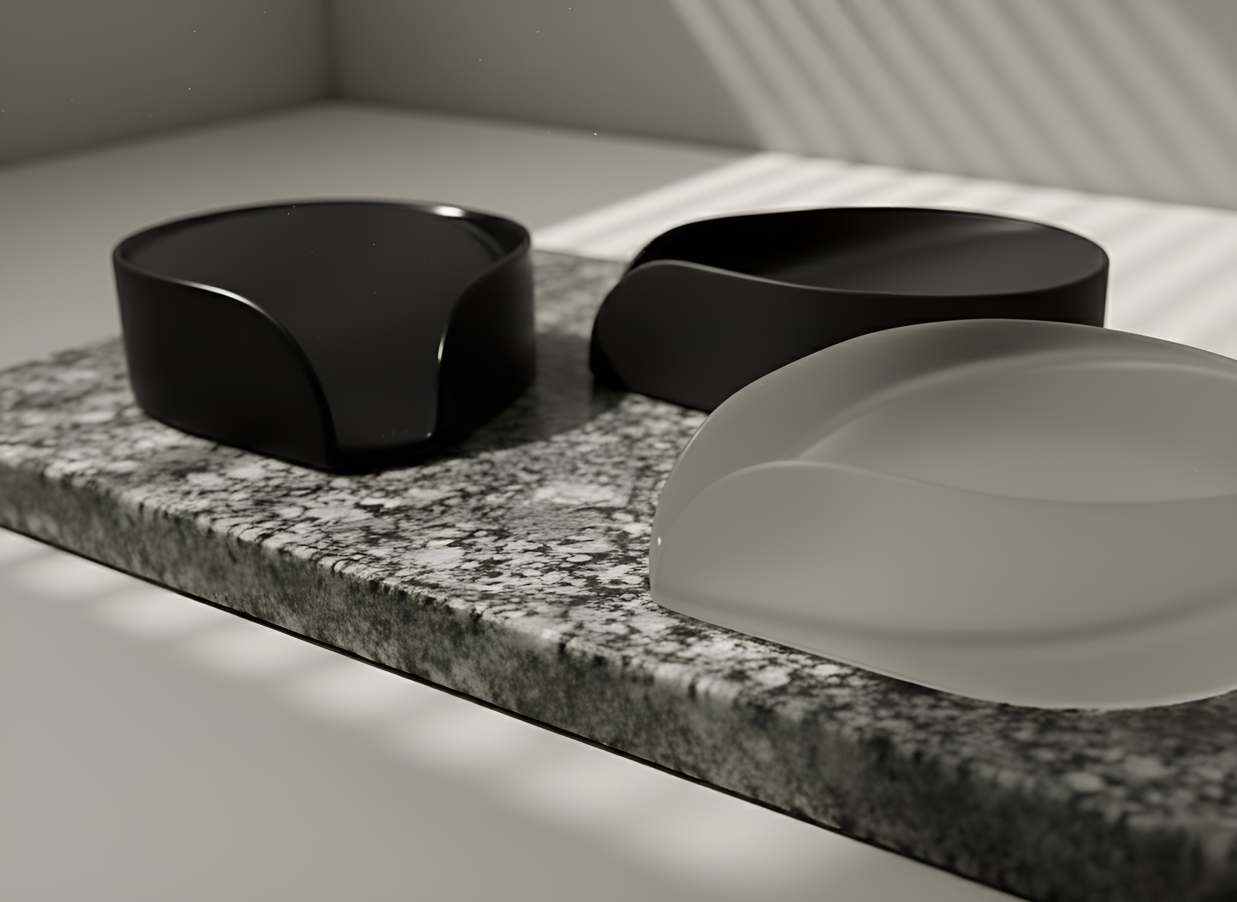 Séria mydelničiek na tuhé mydlo je určená na voľné položenie. Jeden tvar je spracovaný v troch rozdielnych materiáloch. Tvar mydelničiek vychádza z motívu kvapky vody a súvisí s funkciou objektu.