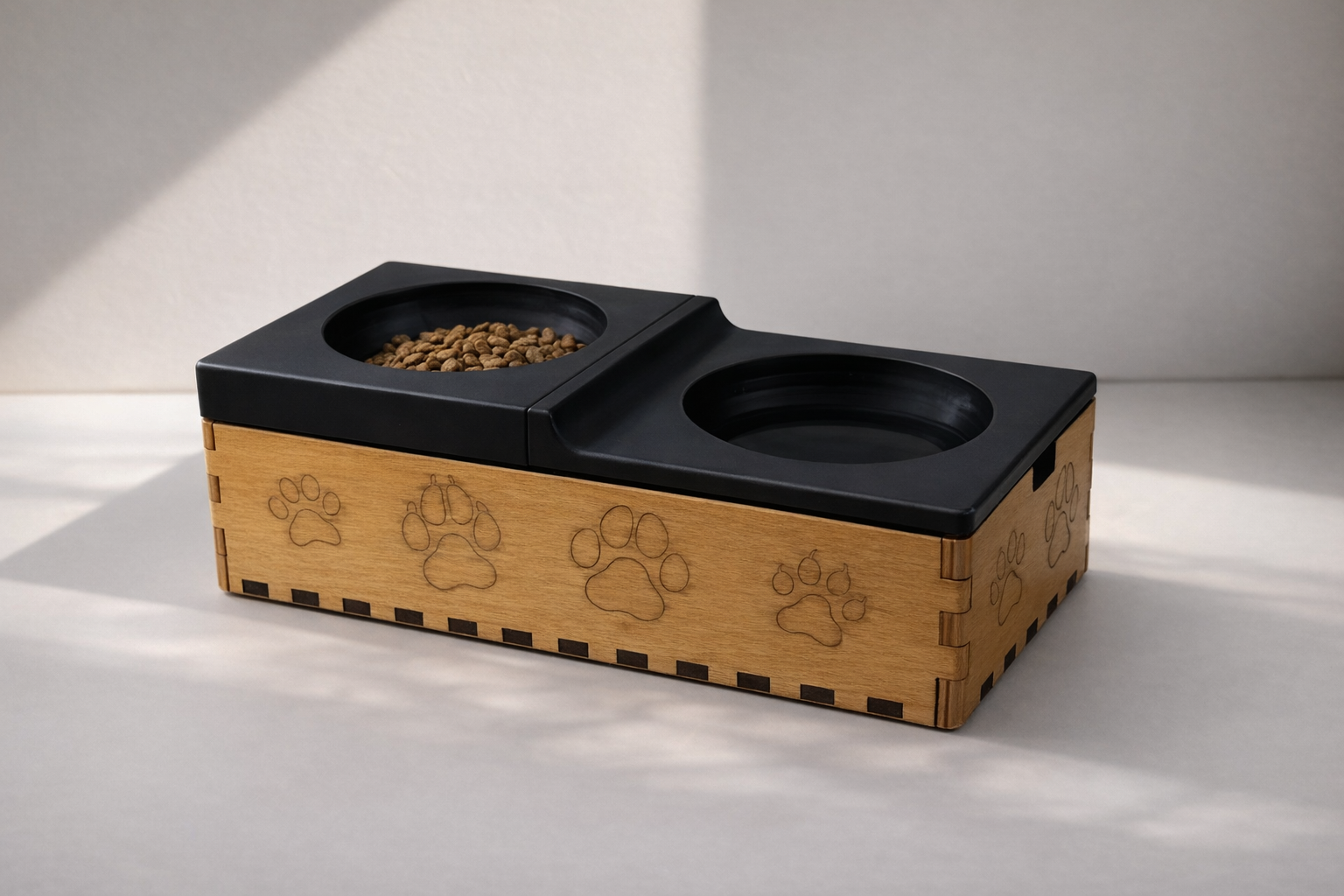 PAWDUO je spoločná miska pre psov a mačky, ktorá spája kŕmenie, hydratáciu a skladovanie krmiva do jedného celku. Vnútorný úložný priestor umožňuje mať granule vždy poruke. Vyvýšená miska na krmivo podporuje správne držanie tela a znižuje zaťaženie chrbtice, zatiaľ čo nižšie umiestnená miska na vodu rešpektuje prirodzený spôsob pitia.