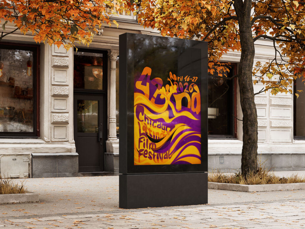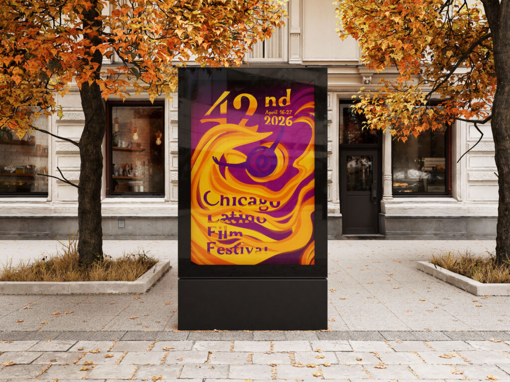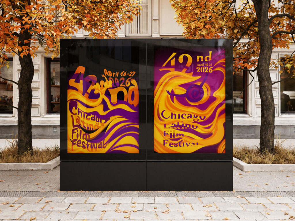 Plakát Chicago Latino Film Festivalu pracuje s motivem tance a pohybu. Dvě varianty plakátu zobrazují tanečnice, jejichž dynamické šaty vytvářejí iluzi pohybu a zároveň zakrývají celý nápis Chicago Latino Film Festival. Pohyb se tak stává nositelem emocí i identity a symbolicky propojuje tanec, film a latinskoamerickou kulturu.