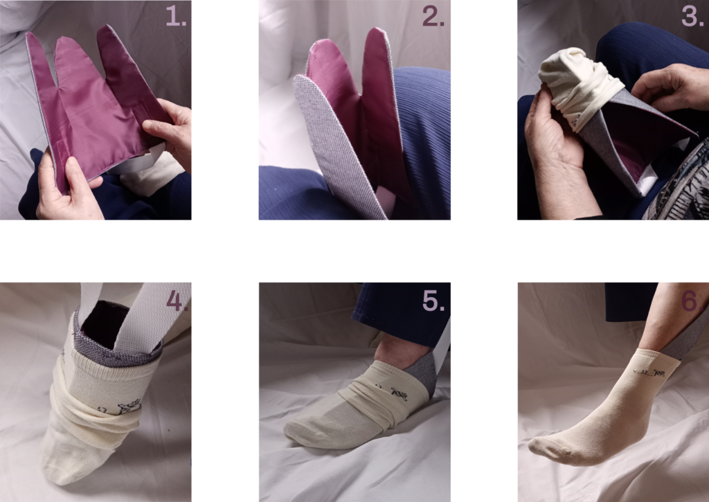 Produkt umožňuje oblékání ponožek bez nutnosti ohýbání se v pase.