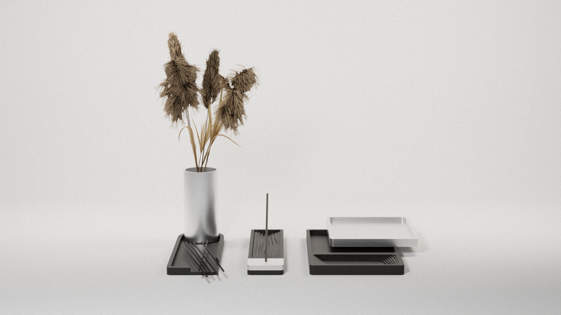 Set tří koupelnových doplňků z hliníku a dubového dřeva zahrnuje odkládací a organizační tác, držák na vonnou tyčinku a vázu s podstavcem, který zároveň slouží jako odkládací plocha pro vonné tyčinky nebo drobné koupelnové předměty.