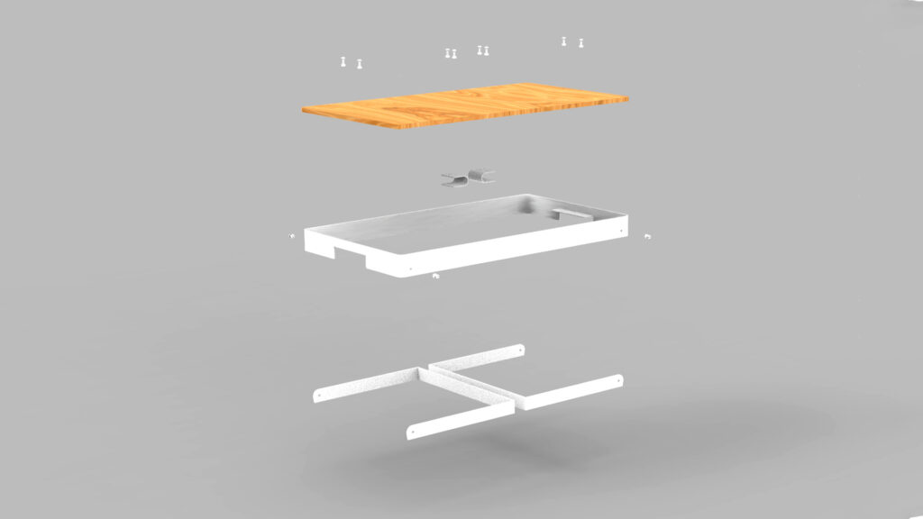 Buková překližka 296 x 546 x 8 mm s hliníkovým rámem z profilu 40 x 1700 x 2 mm. Nohy stolu jsou z plechových profilů 25 x 796 x 3 mm. Celý stolek je spojen dohromady 4 mm šrouby, maticemi a podložkami. Kovové komponenty jsou opatřeny přáškovou povrchovou úpravou v bílé barvě. Překližka je napuštěna lněným olejem.