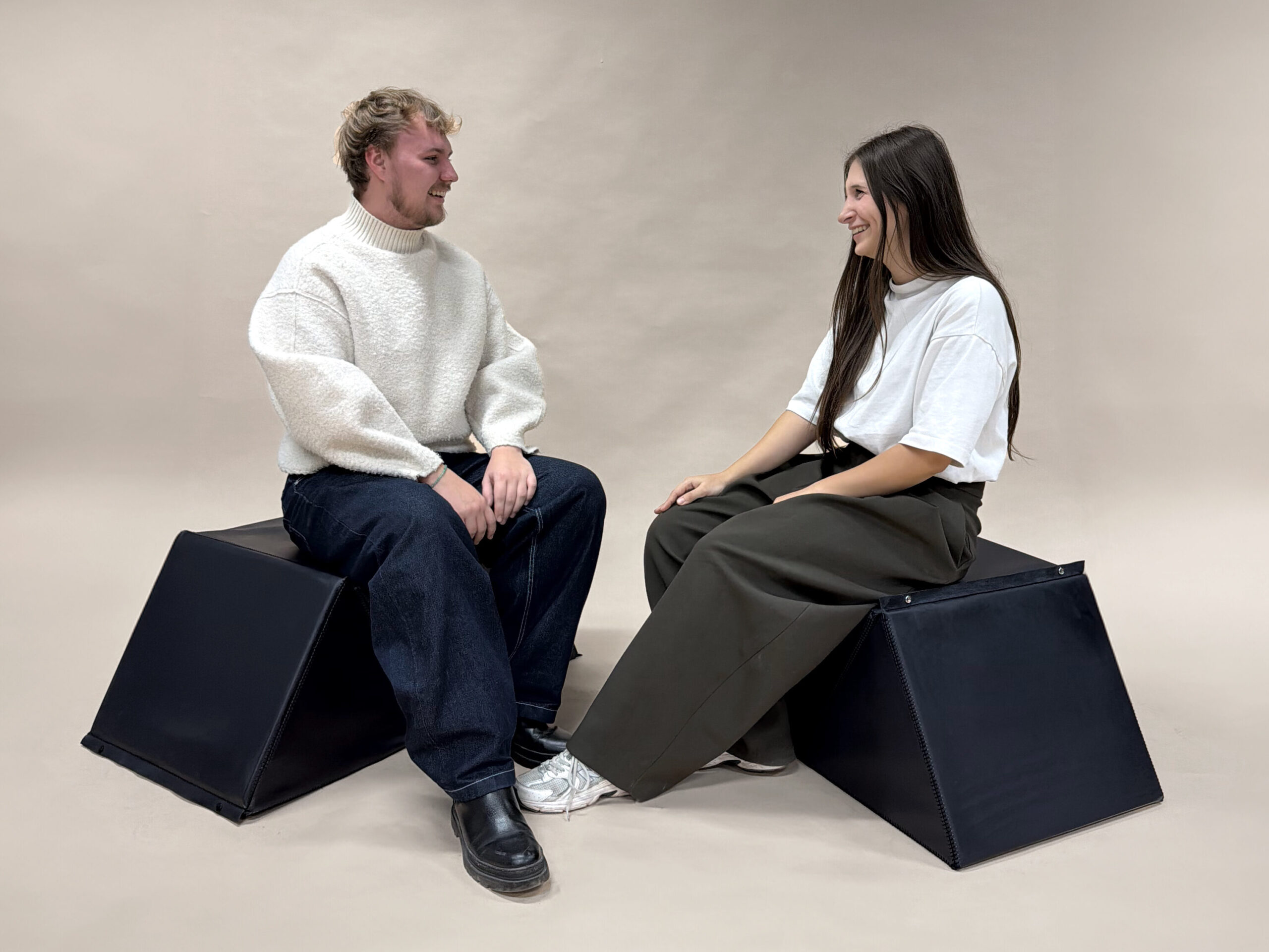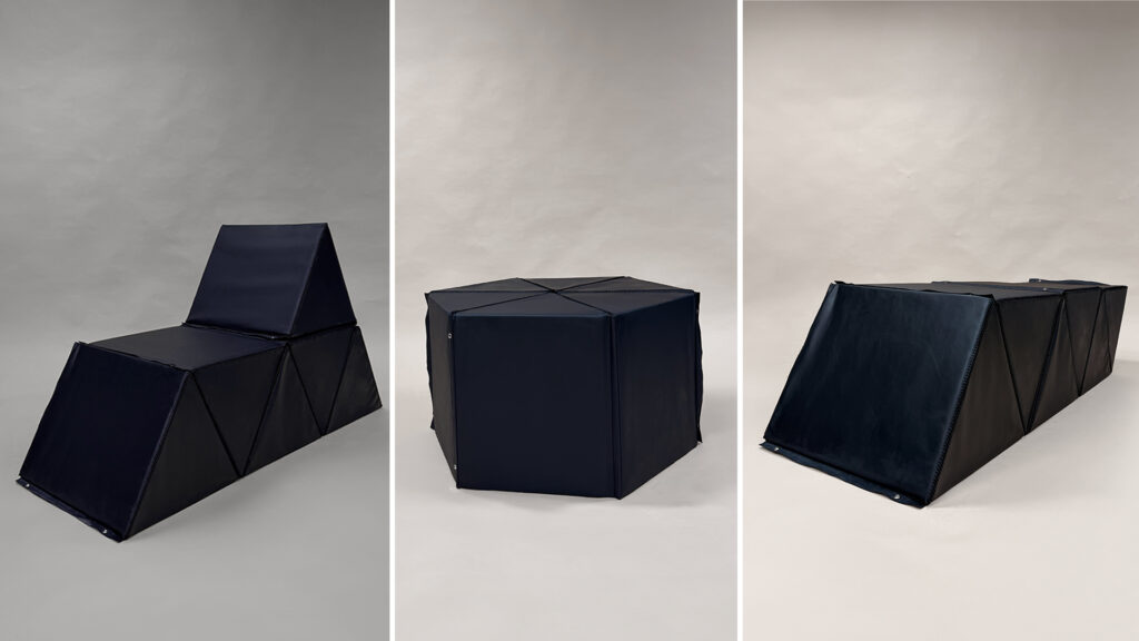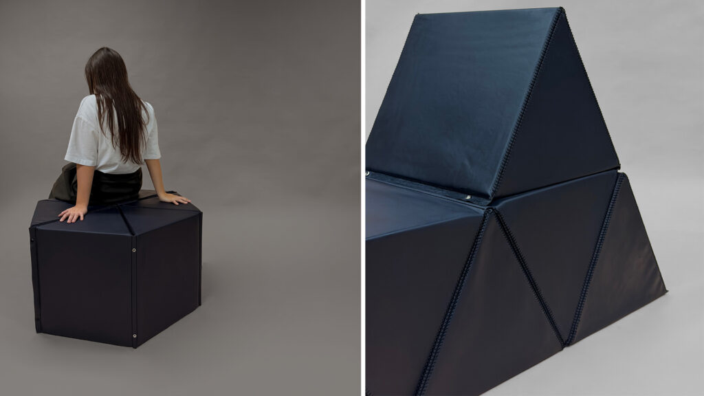 Tri prepojené trojuholníky vytvárajú jeden kompaktný sedací modul, ktorý reaguje na priestor a zároveň ho formuje. Výplň z EVA peny a podlahového polystyrénu zaručuje ľahkosť a komfort, odpadová koža ako obal dodáva materiálu nový život. Minimalizmus, modulárnosť a využitie odpadu sa stretávajú v jednom priestore a posúvajú sa do ďalšieho.