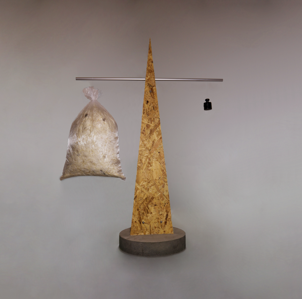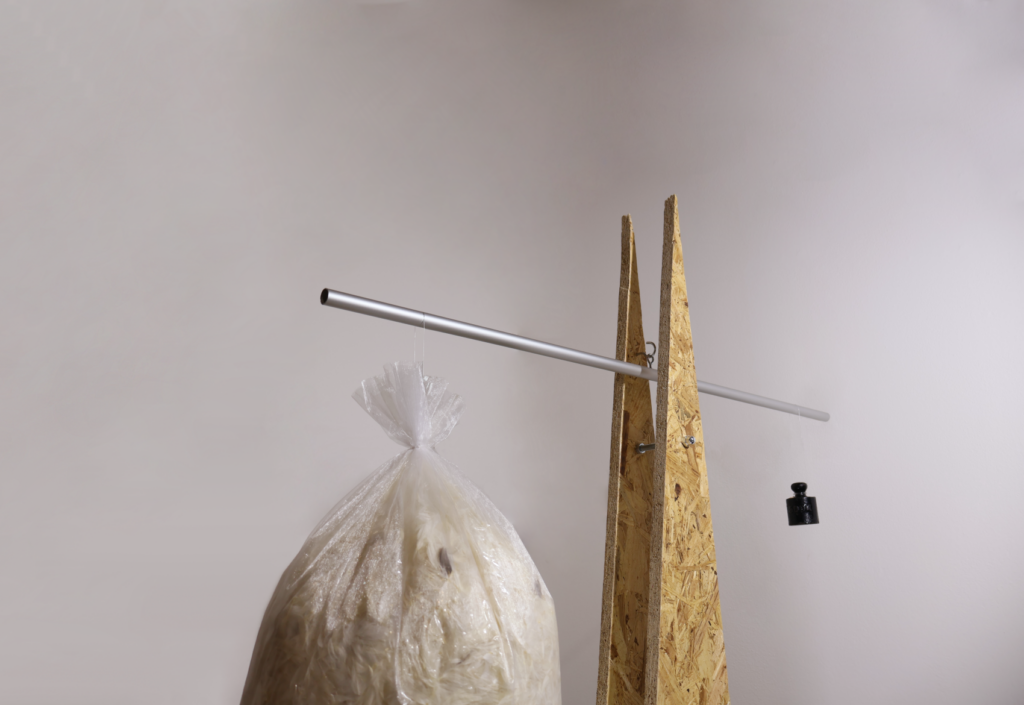 Balanční objekt je tichým, ale zneklidňujícím připomenutím, že velikost a význam neznamenají vždy totéž. Na jedné straně stojí objemný vak s peřím – symbol lehkosti a prostoru. Na druhé straně malé půlkilogramové závaží, hutné a přesně definované.