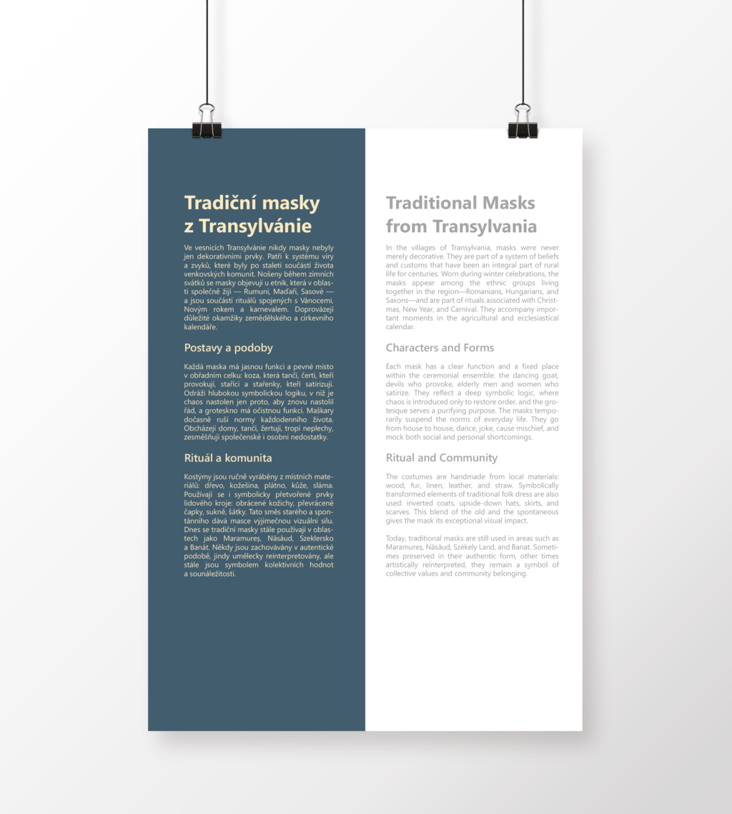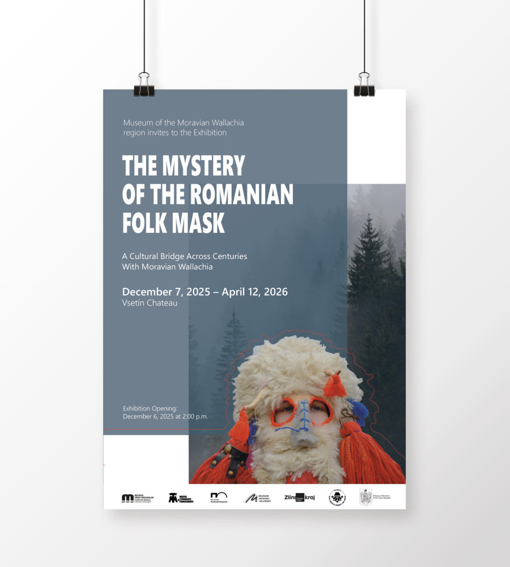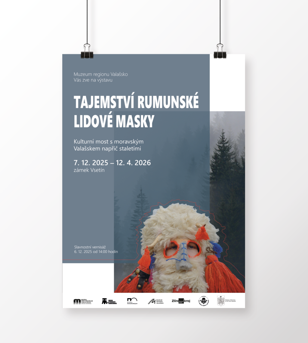 Typografické řešení plakátu a panelu k výstavě Tajemství lidové masky pro Vsetínské muzeum.