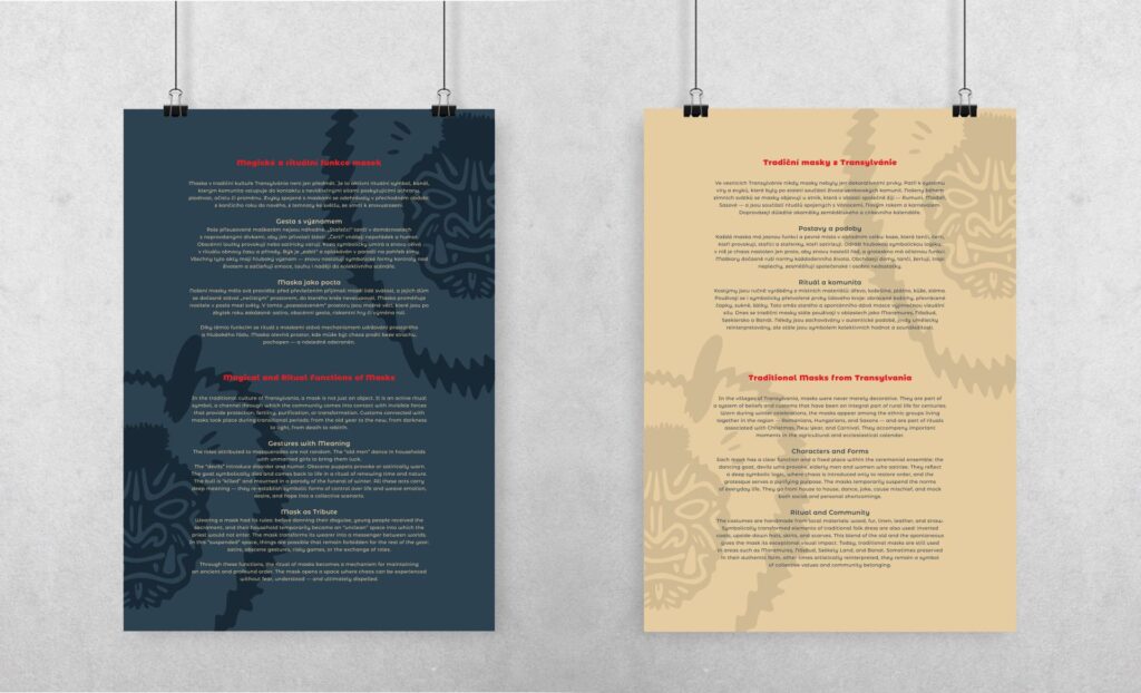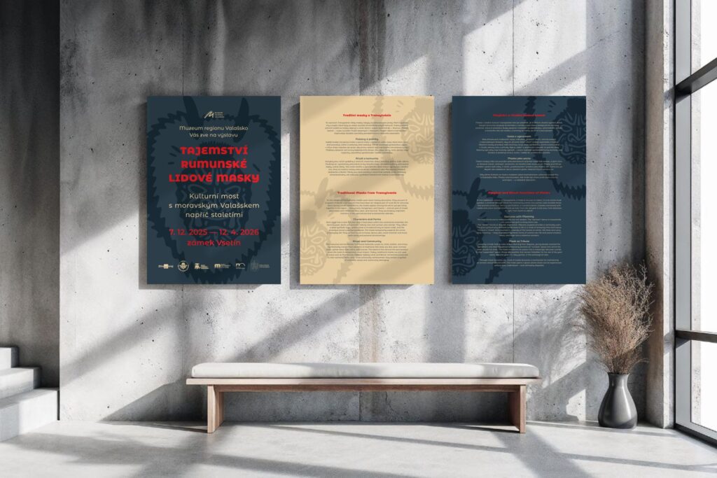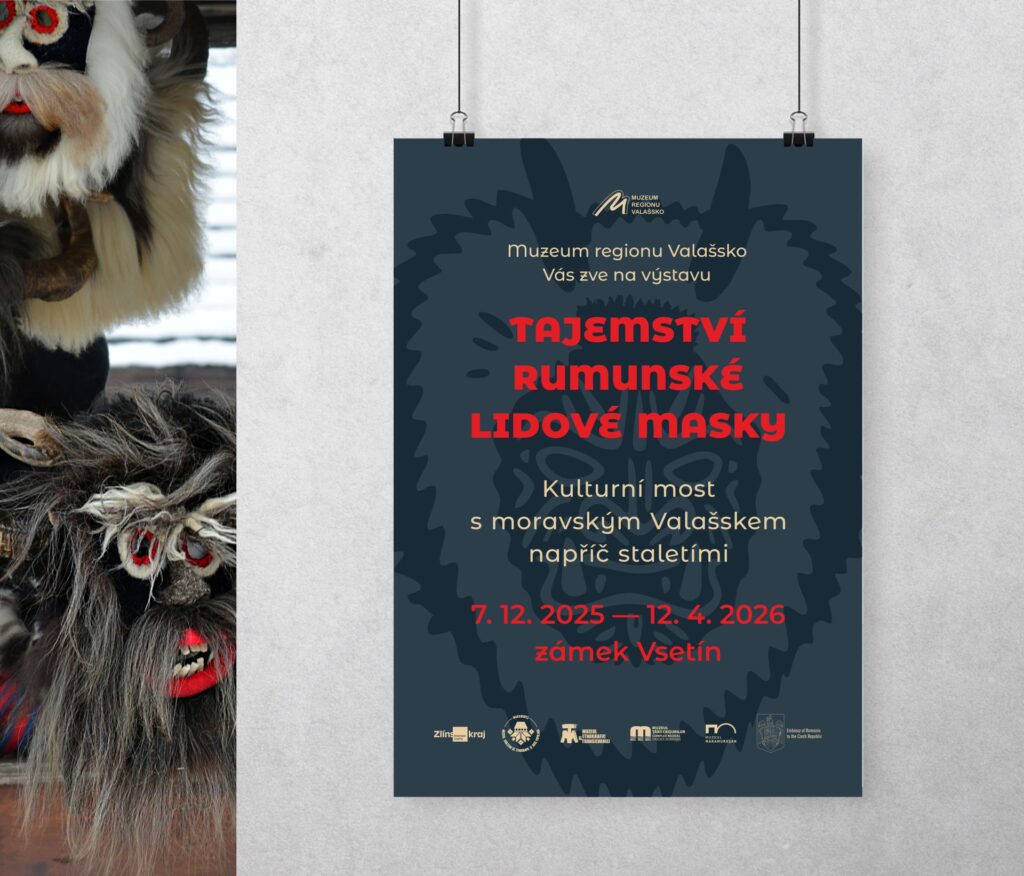 Tiskoviny byly vytvořeny pro jedinečnou výstavu masek pořádanou Muzeem regionu Valašsko, která propojuje dva zdánlivě vzdálené, a přesto blízké světy – Moravské Valašsko a Rumunsko. Prostřednictvím plakátu a textových panelů si můžeme přiblížit kulturu spojenou s tradicí rumunských lidových masek, které nikdy nesloužily jen jako dekorativní prvky. Tyto masky jsou součástí systému víry a zvyků, jež byly po staletí nedílnou součástí života venkovských komunit. Nosí se během zimních svátků a patří k rituálům spojeným s Vánocemi, Novým rokem a karnevalem.