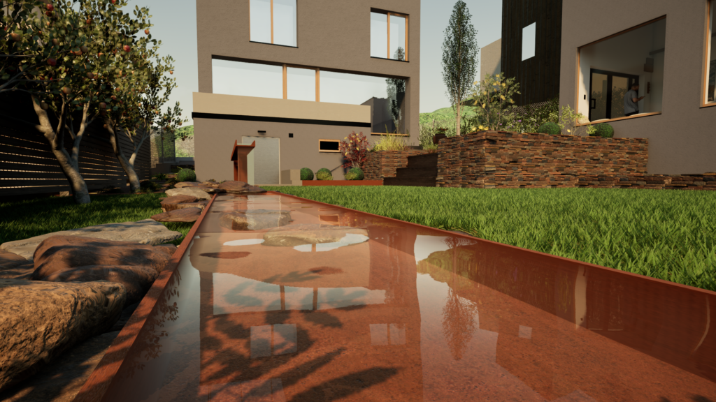 Vodný prvok je centrálnym bodom záhrady, ktorý vnáša do priestoru zmyslový rozmer pomocou pohybu a zvuku vody. Pôsobí upokojujúco, podporuje relaxáciu a zároveň esteticky dotvára celkovú kompozíciu záhrady.