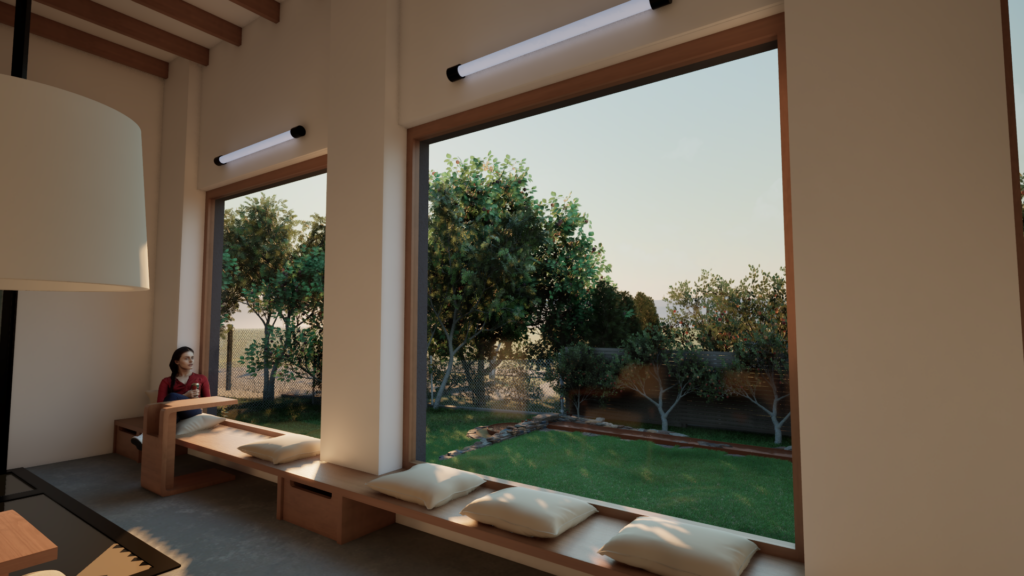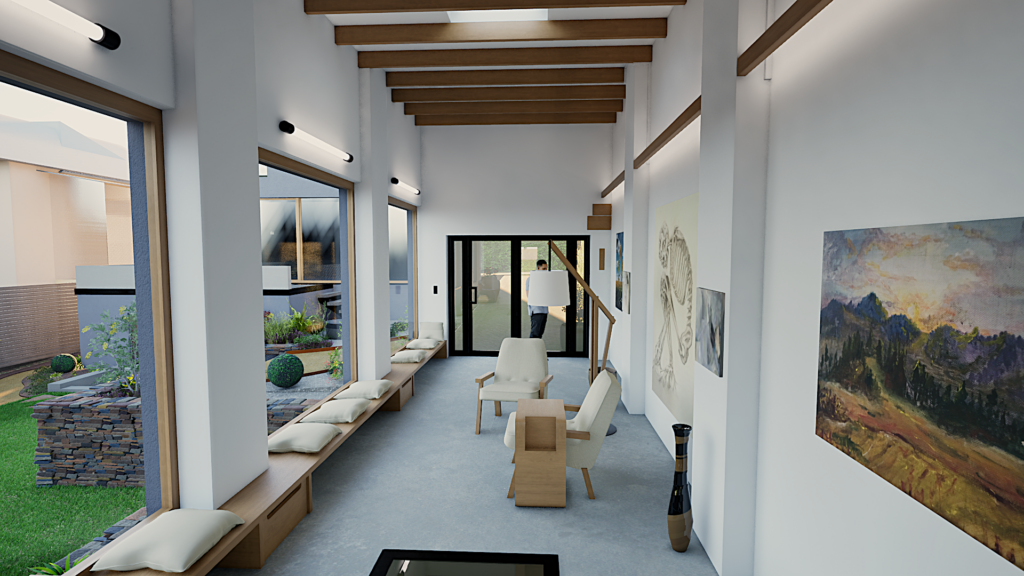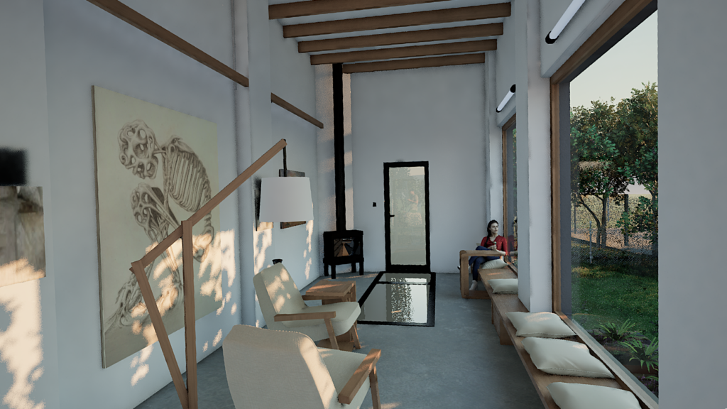 Interiér ateliéru je navrhnutý ako harmonické predĺženie obytnej záhrady, kde sa prirodzené svetlo a výhľady do zelene stávajú súčasťou tvorivého procesu. Priestor podporuje koncentráciu aj kreativitu, vďaka premyslenému rozmiestneniu a použitým prírodným materiálom.