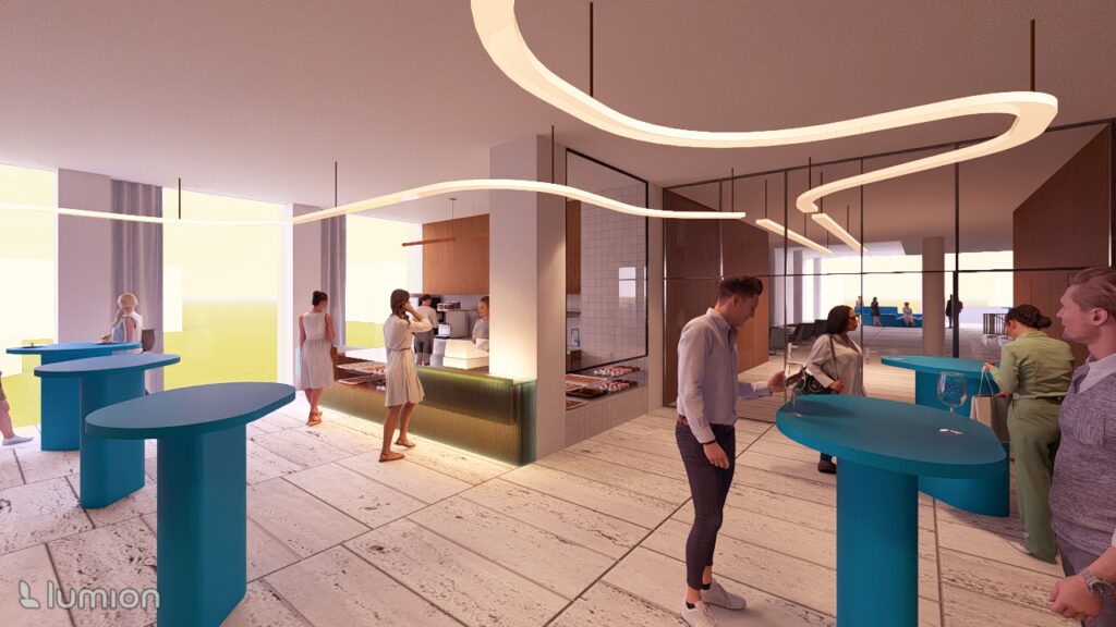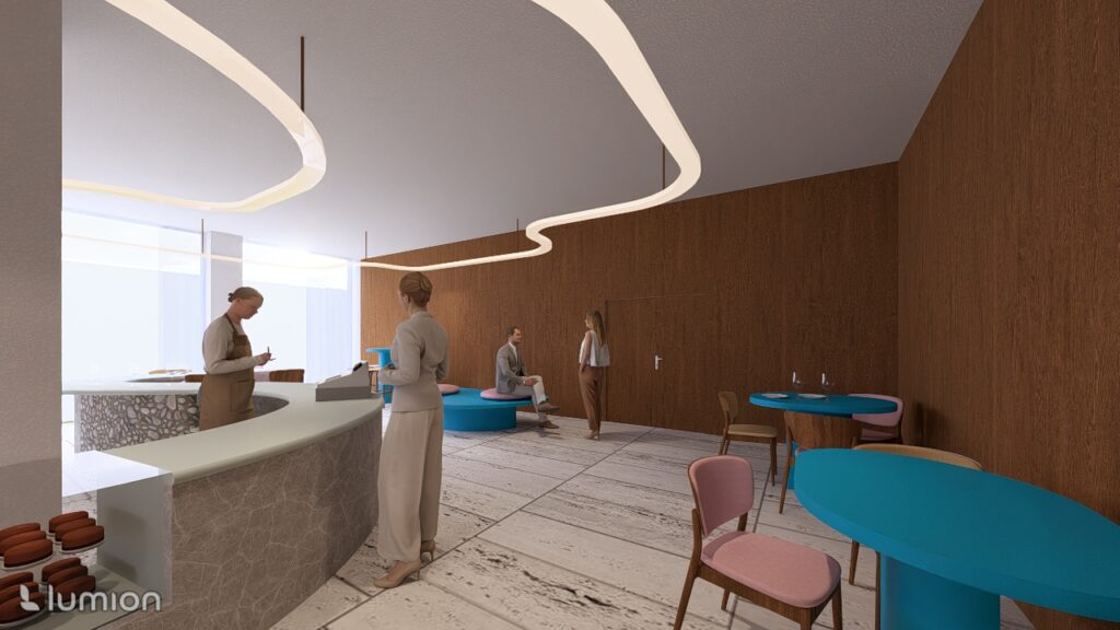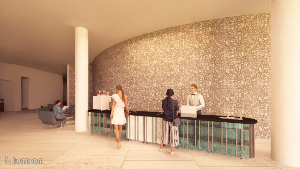 Druhý prostor občerstvení není tolik využíván. Otevírá se pouze při velké návštěvnosti nebo při slavnostních událostí. Proto v tomto prostoru je více než u pravého občerstvení dbáno na zážitek, klid a chvíli na rozhovor mezi návštěvníky. Dominantou je zaoblený pult inspirovaný kamennou mozaikou z přízemí. Tento pult nabízí místo pro vitrínu, prodejní pult a koncová část je přizpůsobena k sezení pro návštěvníky. Ve zbytku prostoru se nacházejí stolky k sezení i stání. Pro zachování podobného vizuálu je použitý stejný systém světelného pásu po celém prostoru.