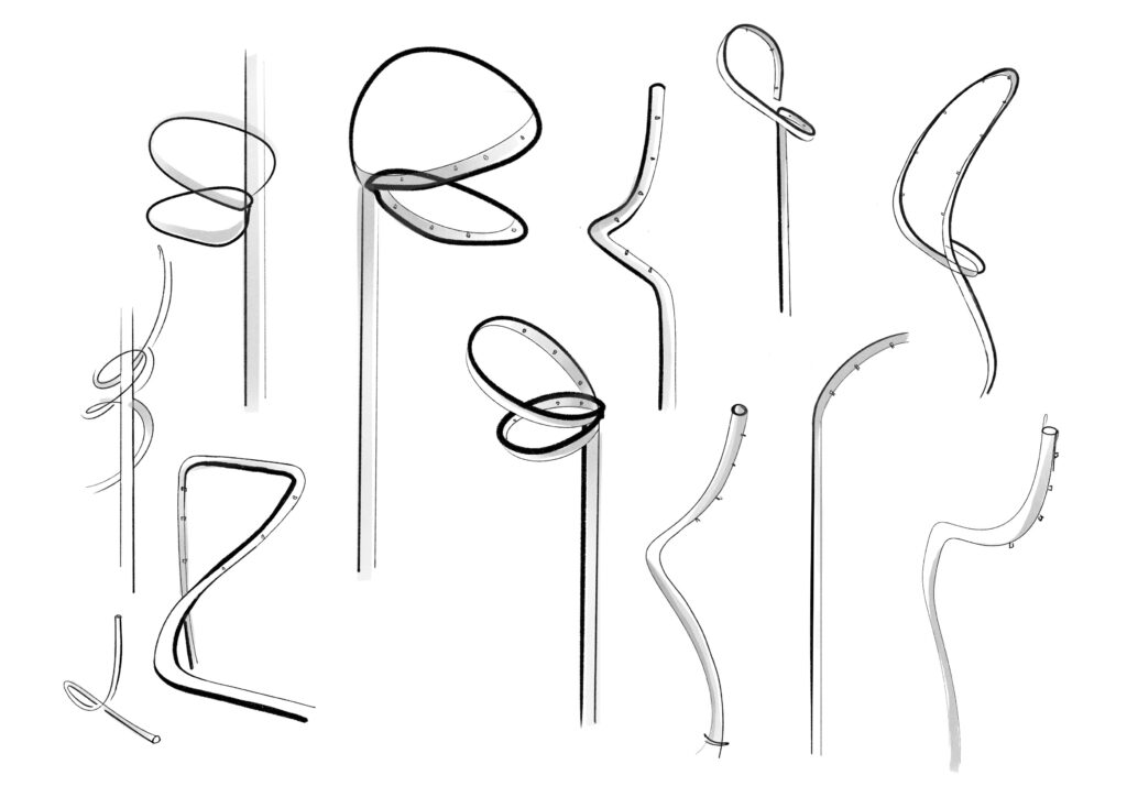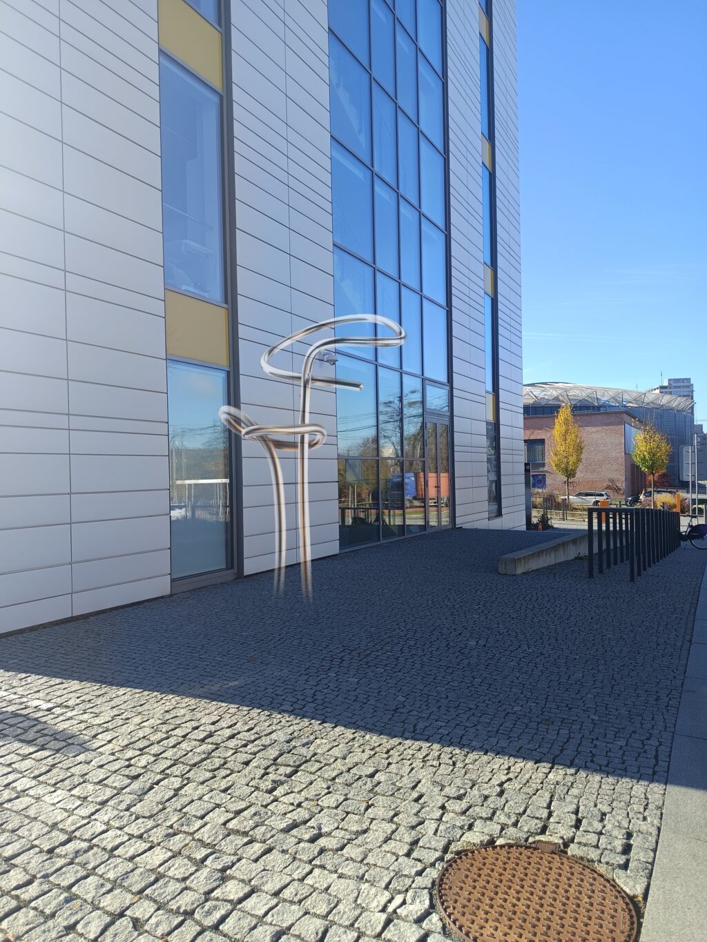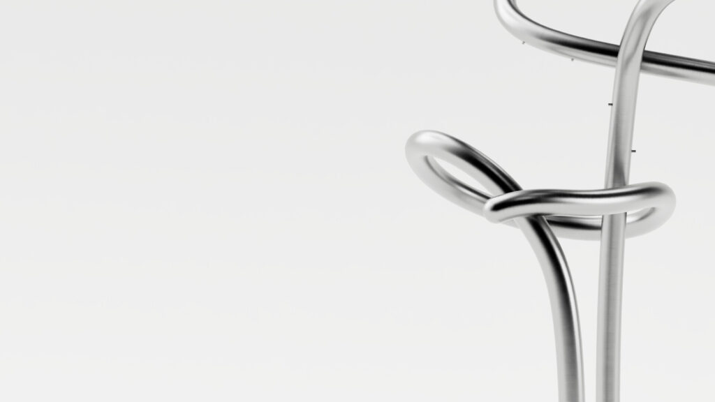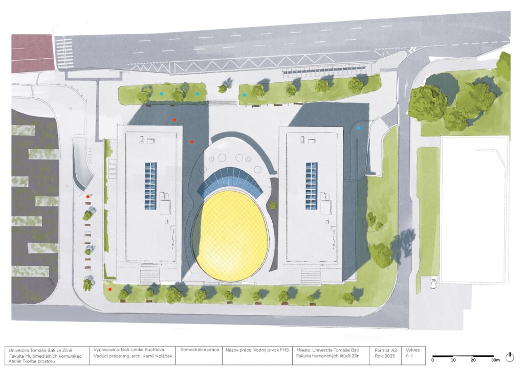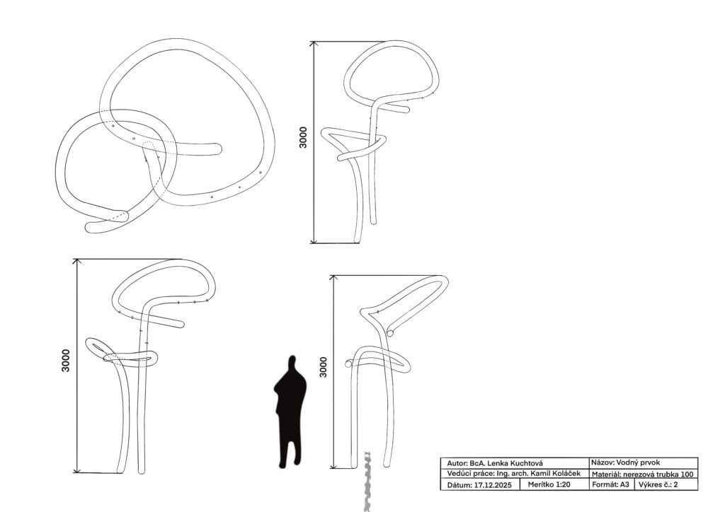 Exteriérový vodný prvok pracuje s vertikálnym prvkom z ohýbanej nerezovej trubky, ktorá vytvára jemnú vodnú hmlu a nadväzuje na existujúci prvok v priestore. Hmla vytvára prechodovú atmosféru a reaguje na pohyb ľudí bez toho, aby vizuálne dominovala okolitej architektúre.