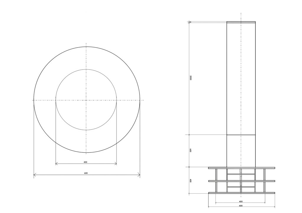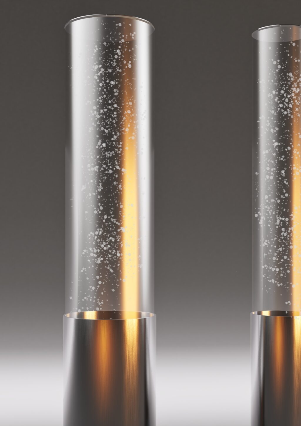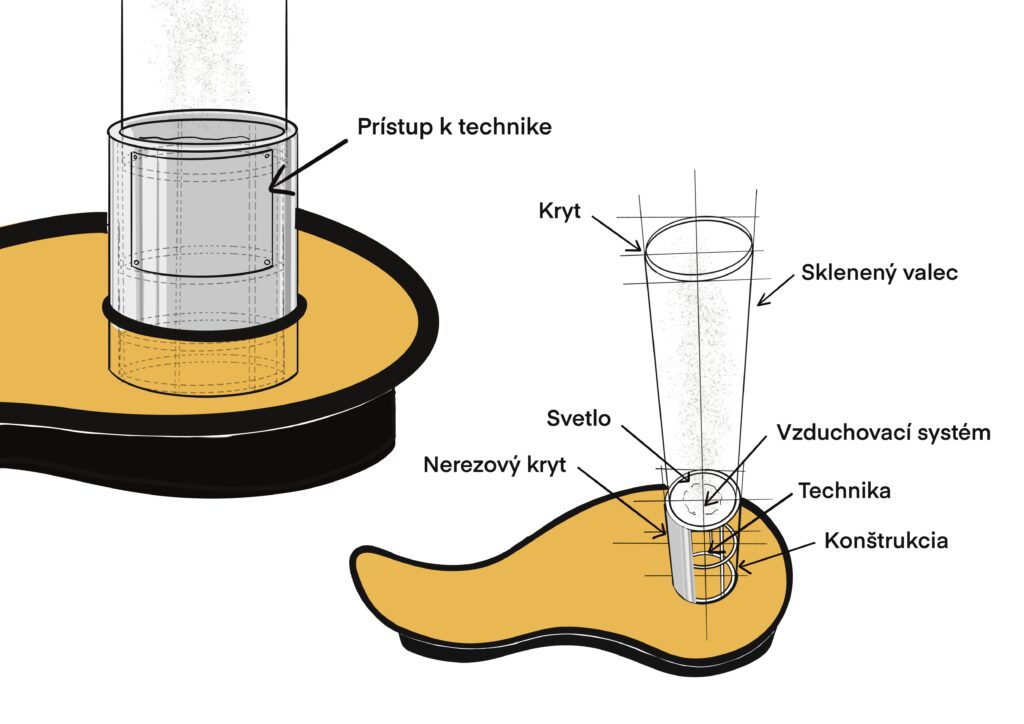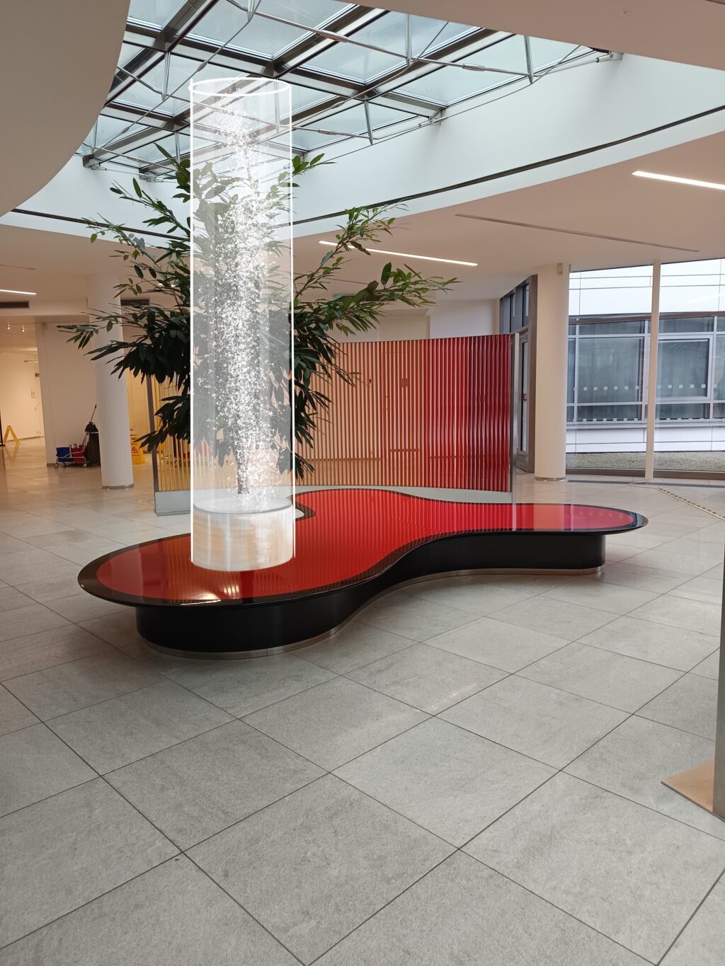 Interiérový vodný prvok je navrhnutý ako vertikálny sklenený valec s nerezovou obrubou, ktorý formou stĺpa prirodzene zapadá do architektonickej štruktúry priestoru. Na princípe vzduchovania vytvára jemný pohyb bublín a tlmený zvuk vody, čím zvyšuje intimitu interiéru a pôsobí ako estetický aj zvukový akcent bez narušenia jeho funkcie.