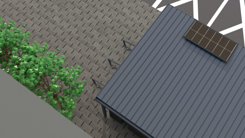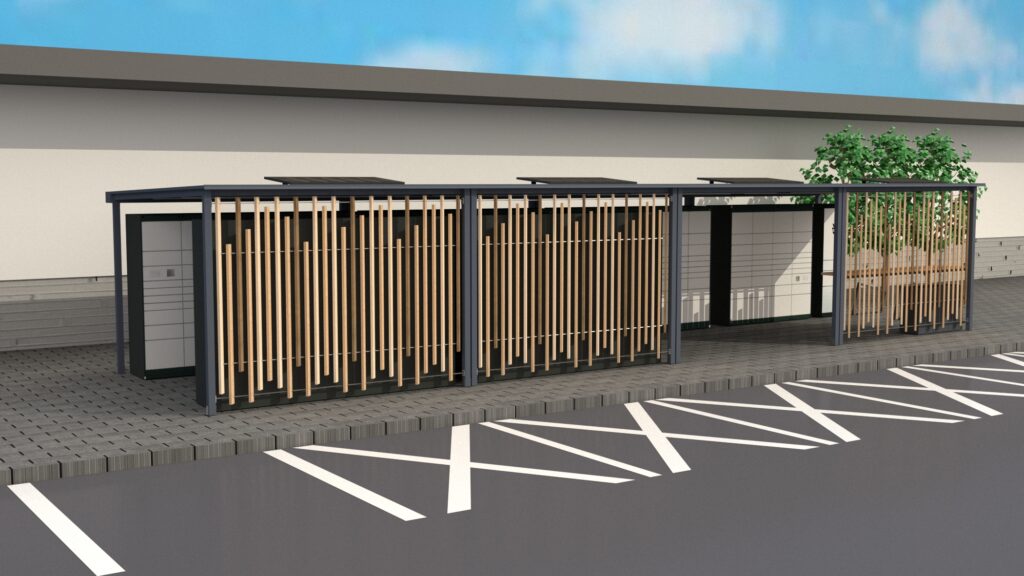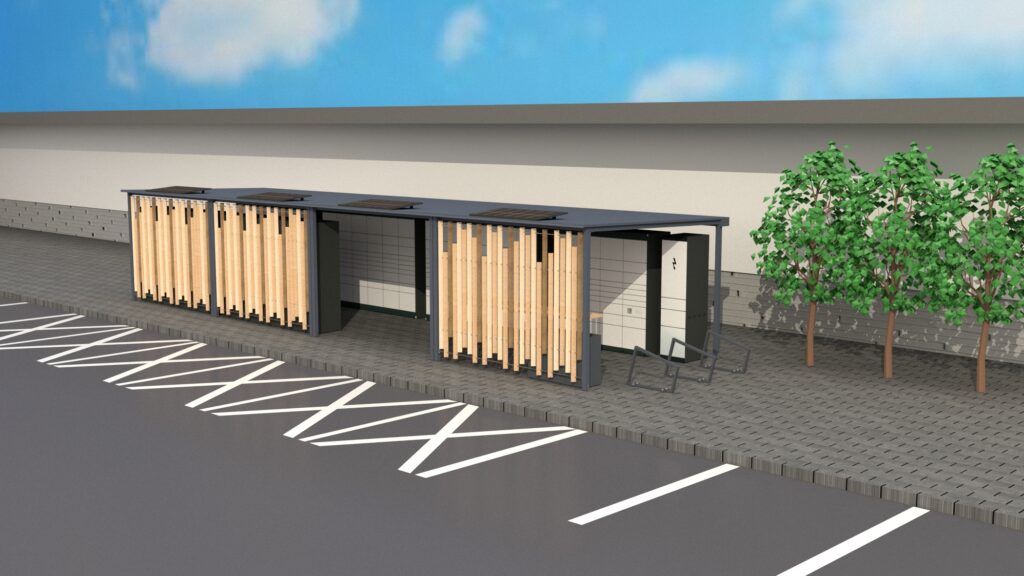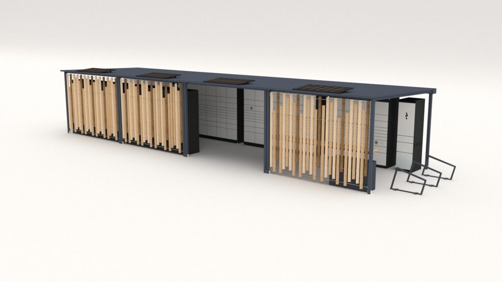 Tenhle doručovací hub je otevřená konstrukce, která se zkládá z modulů s možností neomezeného rozšiřování. Konstrukce je jednoduše vyrobitelná a také je celá montovaná. Díky tomu je usnadněn převoz konstrukce pro montáž a rozdělení ji na několik dílů. V základní variantě mého návrhu se skládá ze čtyřech modulů a je dovnitř možné umístit minimálně 6 doručovacích boxů. Boxy ve vizualizacích jsou firmy Alfa3 v jejich přesných rozměrech. Hub by byl umístěn u parkovišť obchodních center nebo na místech ve městě, kde je dostatečný prostor pro parkování doručovacích dodávek.