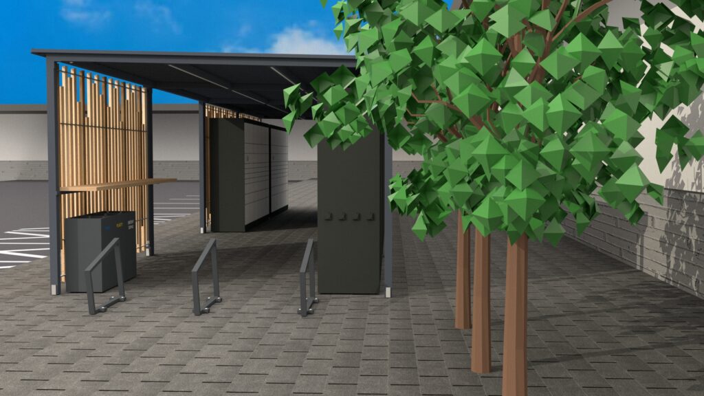 Vstupy do hubu jsou tři: jeden čelní a dva boční (pokud nebudou stojany plné kol, může se právě projít i touhle boční stranou). Hub je prostorný a přístup pro doručovatele zásilek nebo imobilních osob nebude problém. Střecha je vyrobena z falcovaného plechu. Okap je integrovaný a voda je sváděná do zadní části konstrukce. Elektřina prochází ve zbytku konstrukce (přední a střešní), která se vyrábí díky solárním panelům umožnujích celkové funovaní boxů, kamery a také led osvícení pro bezpečnost v noci. Jističe jsou umístěny v jednom panelu boxu, který funguje zároveň jako doručovací box a také jako nabíjecí stanice pro elektrokola. V interiéru hubu je umístěna police pro odložení nebo vybalení objednávky přímo na místě. Pro dodřžování čistoty jsou zde umístěny odpadkové koše na třídění (papír, plast, směsný odpad).