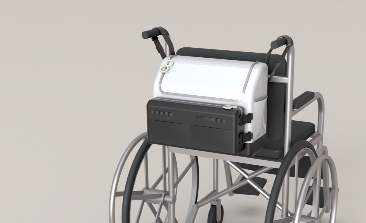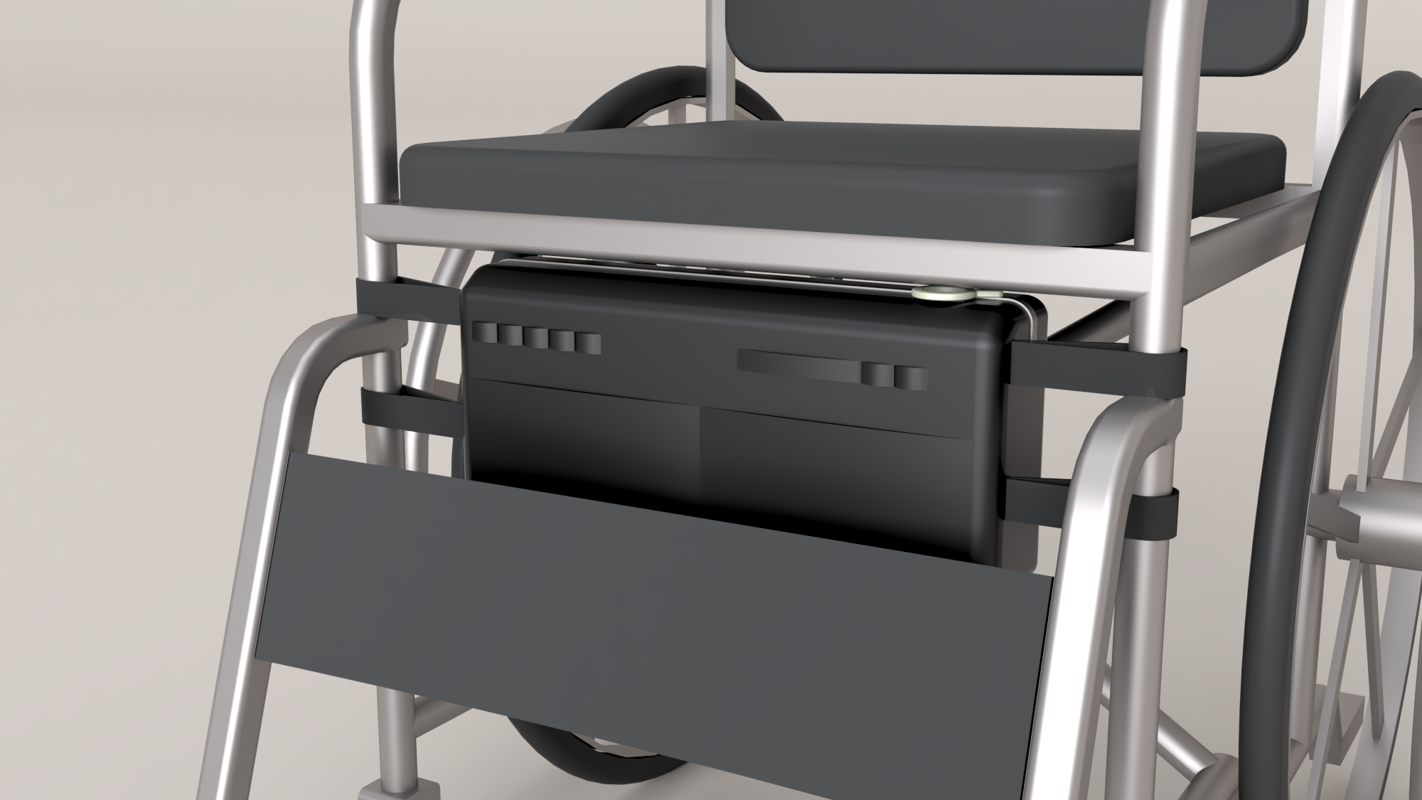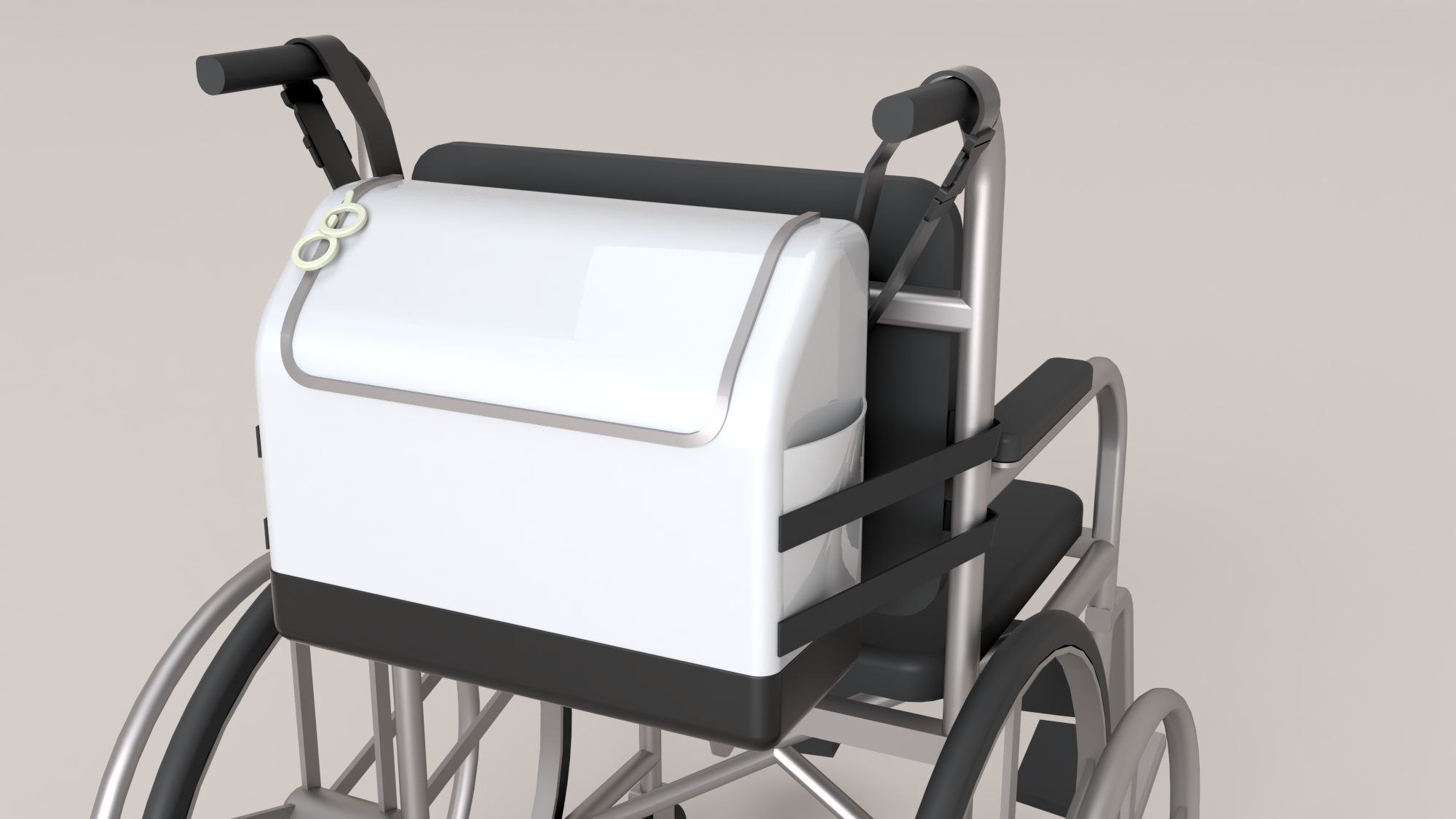 HandiBag is a durable and robust bag designed for all types of wheelchairs. It consists of two parts: a large main bag and a smaller additional bag. Thanks to a system of straps and buckles, the bags can be easily repositioned and their placement changed on the main bag, the side frame of the wheelchair, or near the user’s legs. The straps can also be used to secure other personal items or to further fix the bag to the wheelchair.