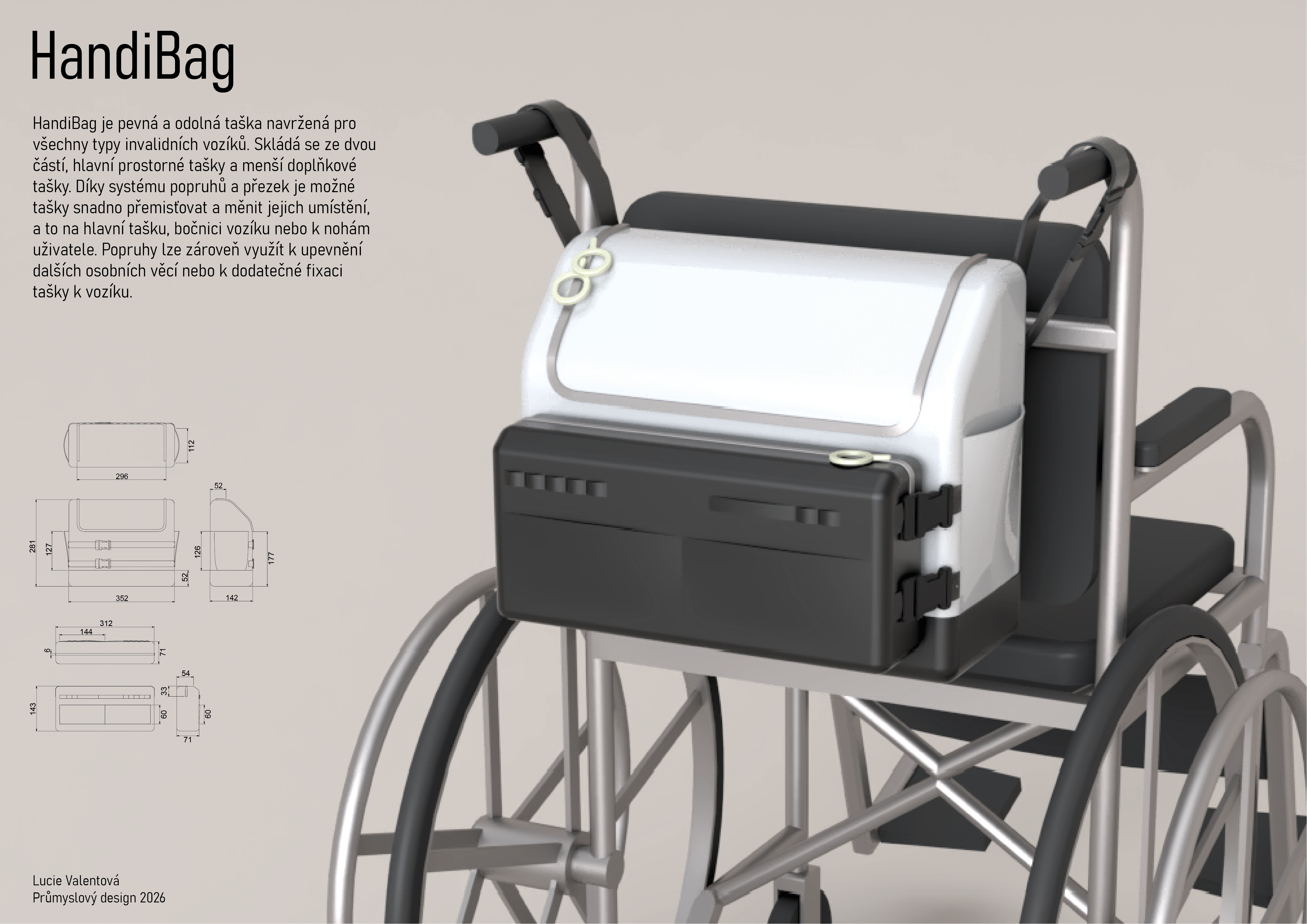 HandiBag je pevná a odolná taška pro všechny typy invalidních vozíků. Tvoří ji dvě části: hlavní prostorná taška a menší doplňková taška. Systém popruhů a přezek umožňuje snadné přemisťování a změnu umístění na hlavní tašku, bočnici vozíku nebo k nohám uživatele. Popruhy zároveň slouží k uchycení dalších osobních věcí nebo k dodatečné fixaci tašky k vozíku.