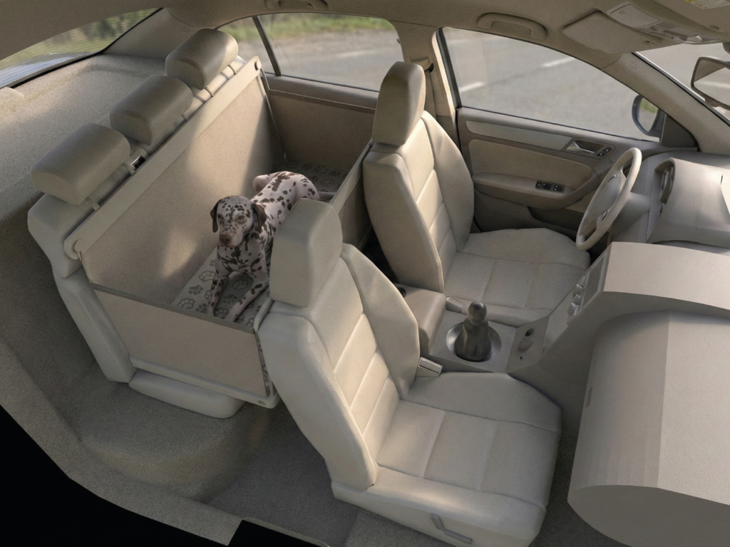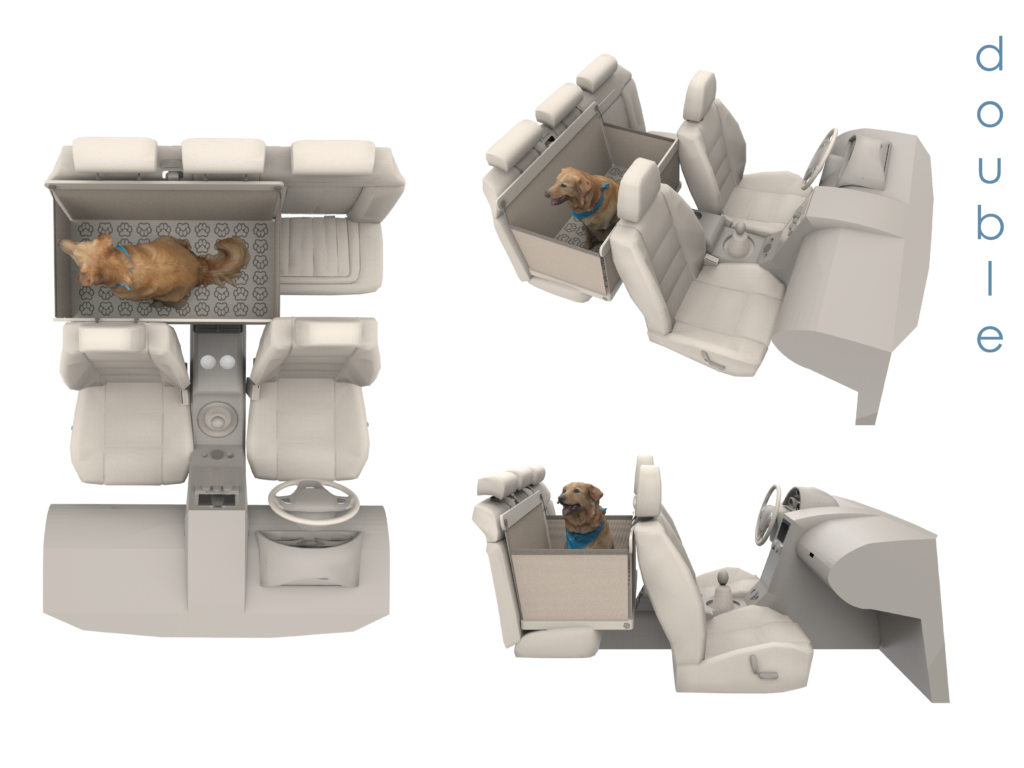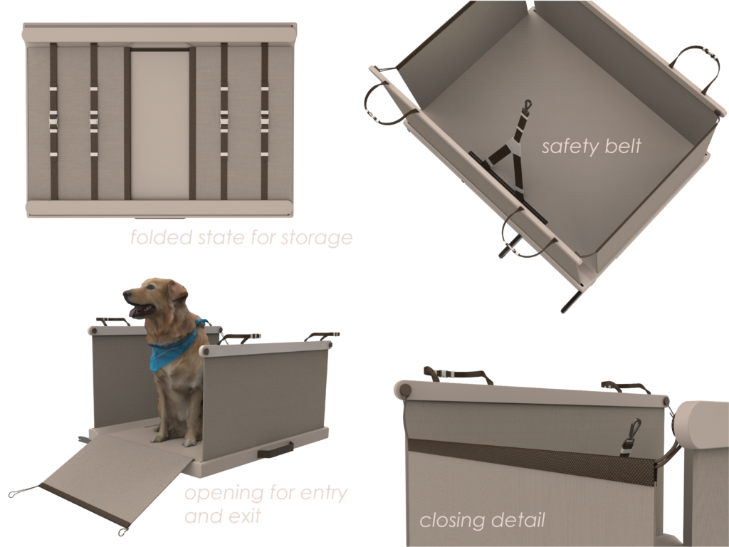 ROLL UP is designed for the safe transport of medium and large dogs on the back seats of a car. It features a sturdy board secured with the ISOFIX system that slightly extends over the edge of the seats, providing a stable and spacious area. The board includes a safety strap to attach the dog’s harness. An integrated roller system protects the seats, with fabric side panels that attach to the rollers to define the space and allow the dog to easily get in and out. The product is portable and easy to store.