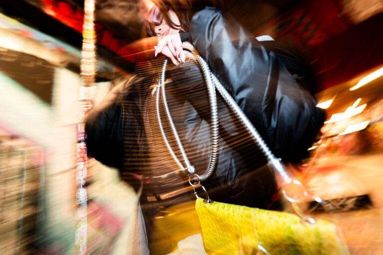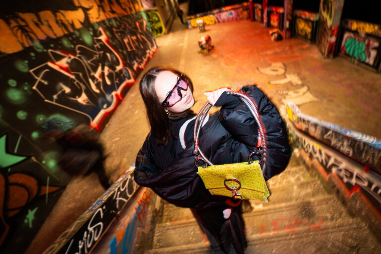 Fashion fotografie zachycující kabelku vyrobenou Kateřinou Jandovou, studentkou druhého ročníku ateliéru Design oděvu.